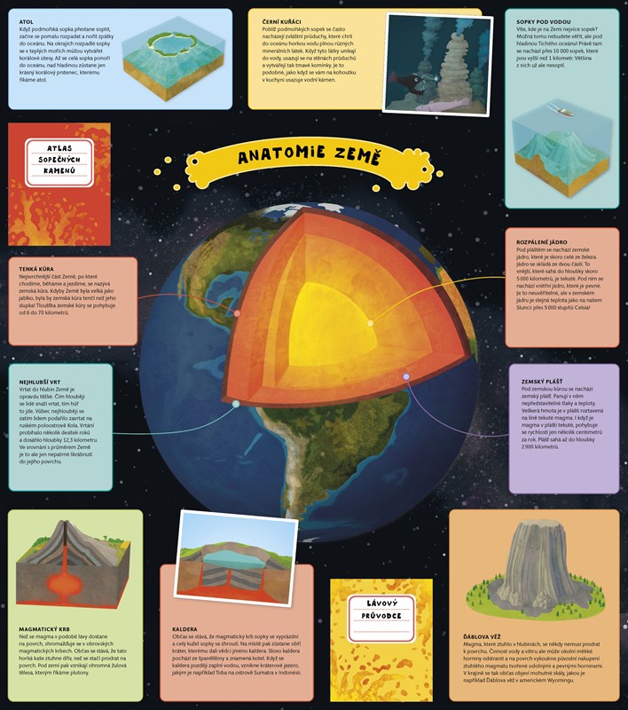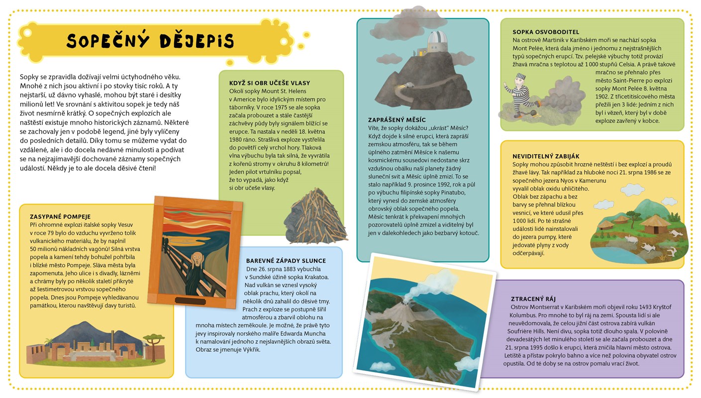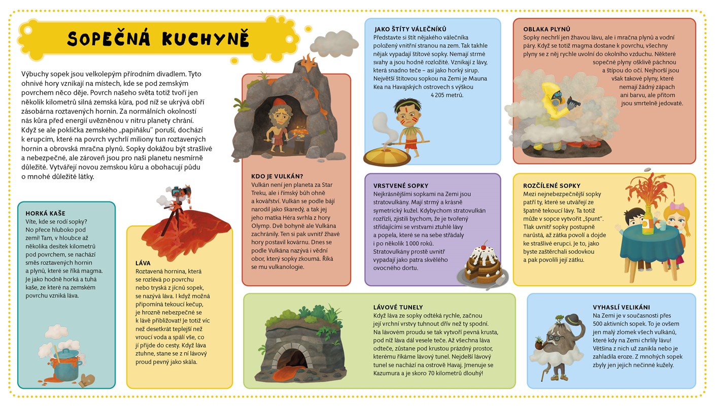 Sopky rozpálené aktivní i ty, které odpočívají letitým spánkem odjakživa vzbuzovaly hrůzu lidí, ale také je inspirovaly k řadě otázek. Proč se tyhle vulkány čas od času nasupí a plivou kolem sebe ohnivými slinami, odkud se bere magma a co je vlastně láva? A tak je začali krůček po krůčku zkoumat a studovat. Vymysleli proto dokonce i samostatnou vědu zvanou vulkanologie. Chcete se také na chvíli stát vulkanologem? Žádný problém. Na šesti rozkládacích stránkách nabitých sopečnými informacemi se z vás stane badatel vulkánů co by dup.