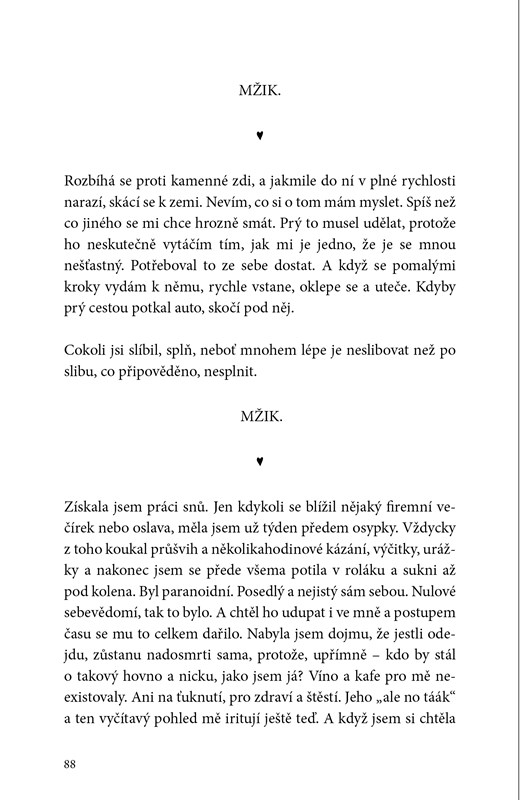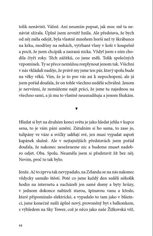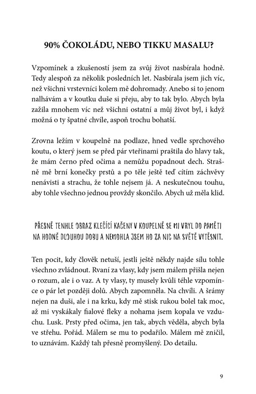 „Můj život byl tak dokonalý a nalajnovaný, jako bych vypadla z čítanky. A tak jsem si v devatenácti letech nasadila na hlavu sněhově bílý závoj, na ruku prstýnek a vdala se. Za manipulátora. Za psychopata. A odletěla s ním na druhý konec světa.“