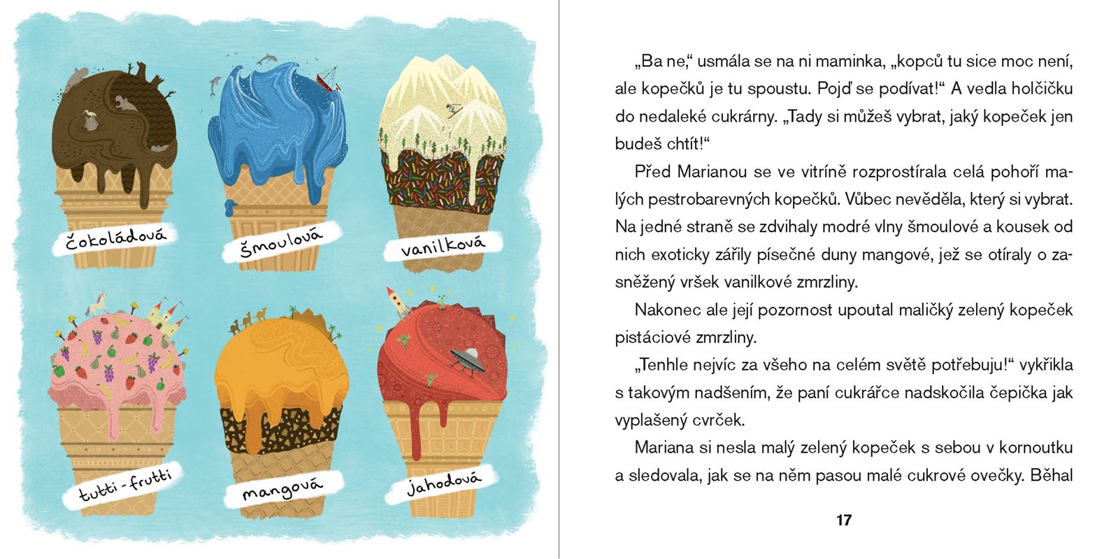 Mariana se s maminkou přestěhovala do velkého města. K jejímu překvapení je tam ale příliš velké horko a málo zelených kopců, ze kterých by se daly válet sudy. Aby maminka svoji dcerku rozveselila, koupí jí alespoň kopeček pistáciové zmrzliny. Horko je ale neúprosné a zmrzlina se začne roztékat. Podaří se Marianě před letní výhní ochránit malé pistáciové človíčky? Pohádka o hledání chladného stínu uprostřed rozpáleného města.