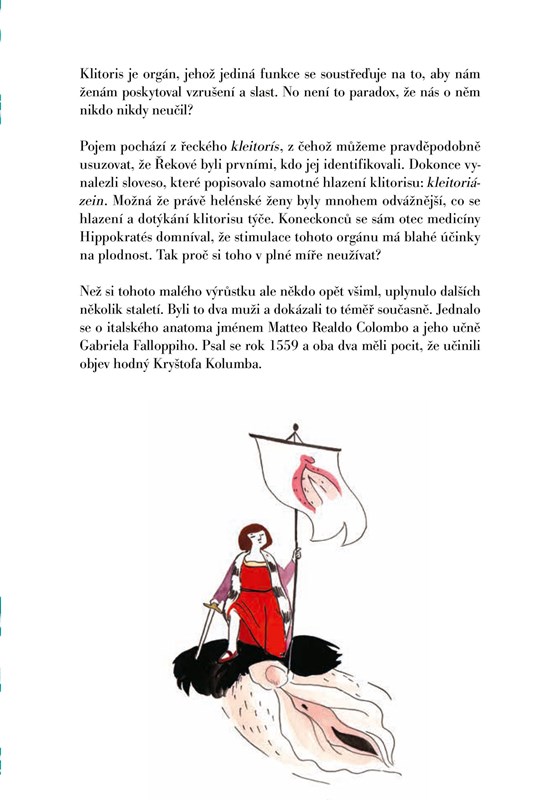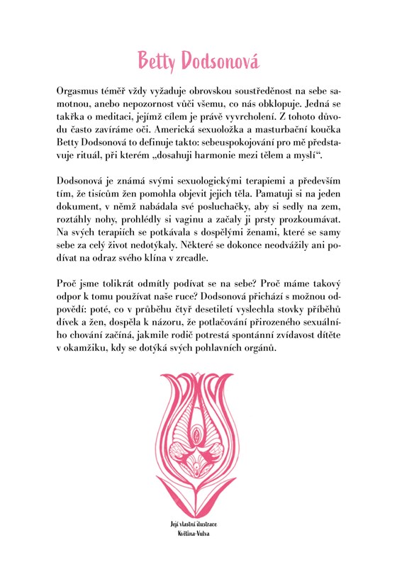 Mária Hesseová, výtvarnice a autorka úspěšných ilustrovaných životopisů, vás zve, abyste odhodily ostych, prozkoumaly své tělo a nahlédly pod roušku ženské sexuality. V této vizuálně jedinečné knize se na pozadí autorčina osobního příběhu dozvíte spoustu zajímavých informací o anatomii ženského těla, ale například i o vývoji vnímání ženské sexuality, sexuálních pomůckách či mýtech, které se s pohlavním stykem po staletí pojily, a seznámíte se s významnými ženami historie, které se o sexualitě nebály otevřeně mluvit. Všechno dohromady však směřuje k jedinému – boření všemožných předsudků a tabu, které ženám kladou překážky na cestě k plnohodnotnému pocitu slasti.