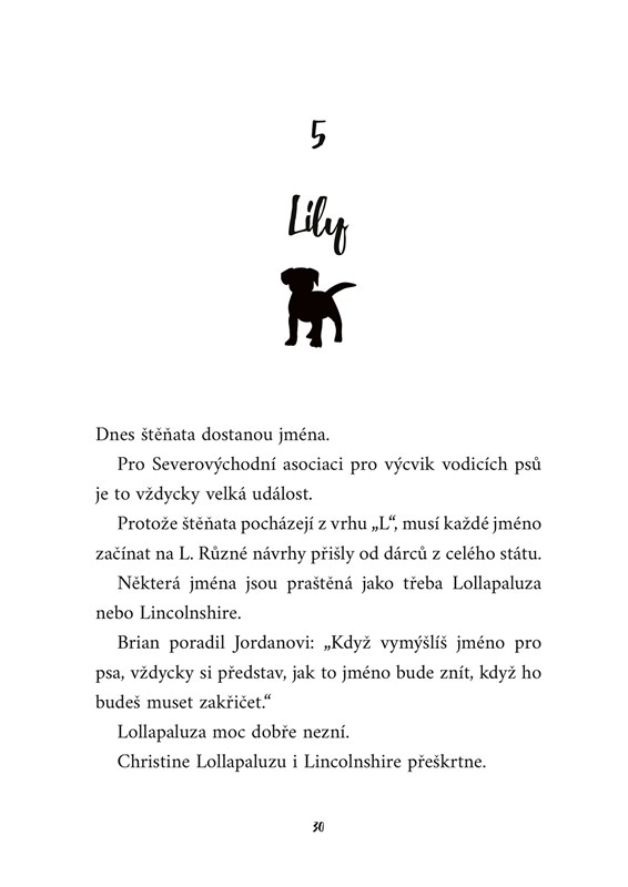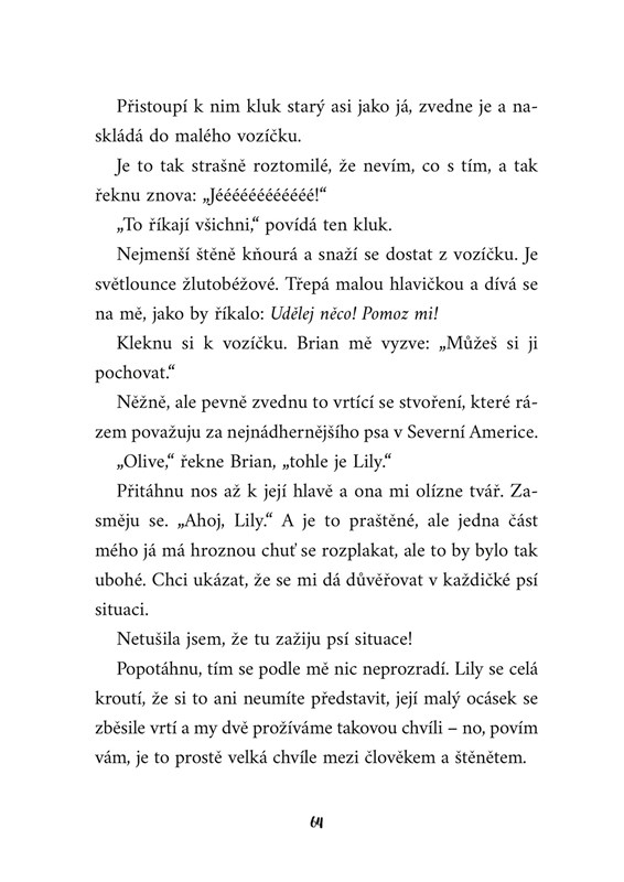Dvanáctiletá Olive nade vše miluje psy. Maminka jí umřela už dávno a teď ztratila i tatínka. Nastěhuje se proto k dospělé nevlastní sestře Maudie. Ta jí nejdříve nechce psa dovolit, protože jejich život je už tak dost chaotický, ale pak se Olive naskytne příležitost starat se o štěně, ze kterého se má stát asistenční pes. Olive vychovává Lily, jak nejlépe dokáže, protože jen ta nejschopnější štěňata se mohou stát vodicími psy. Zároveň ale ví, že pokud Lily zkouškou projde, Olive ji navždy ztratí...
