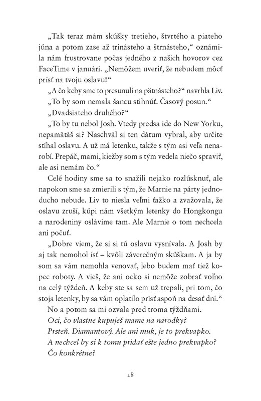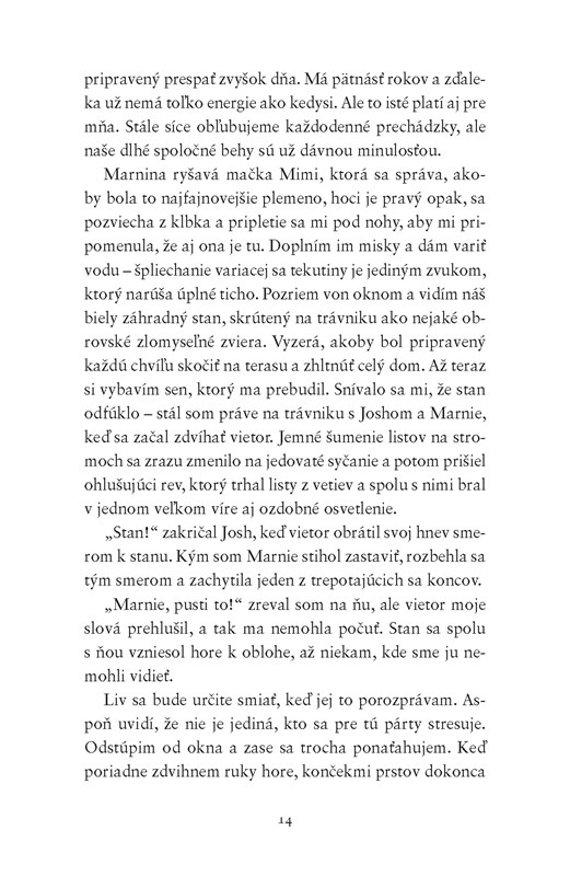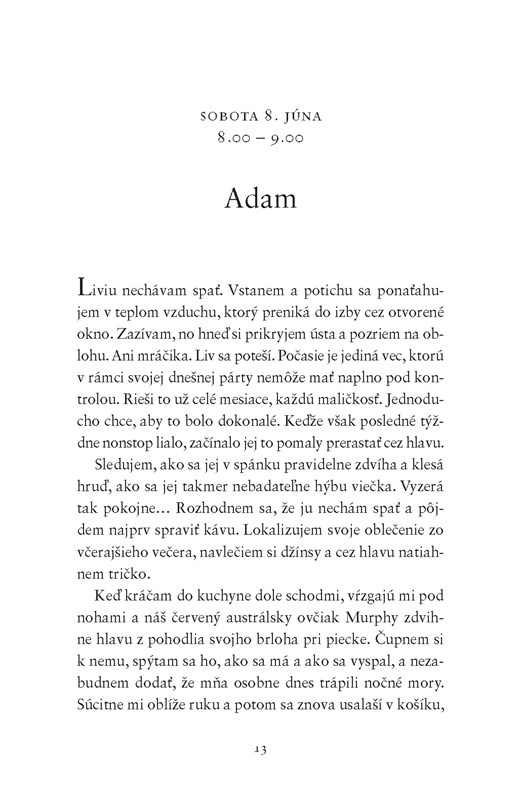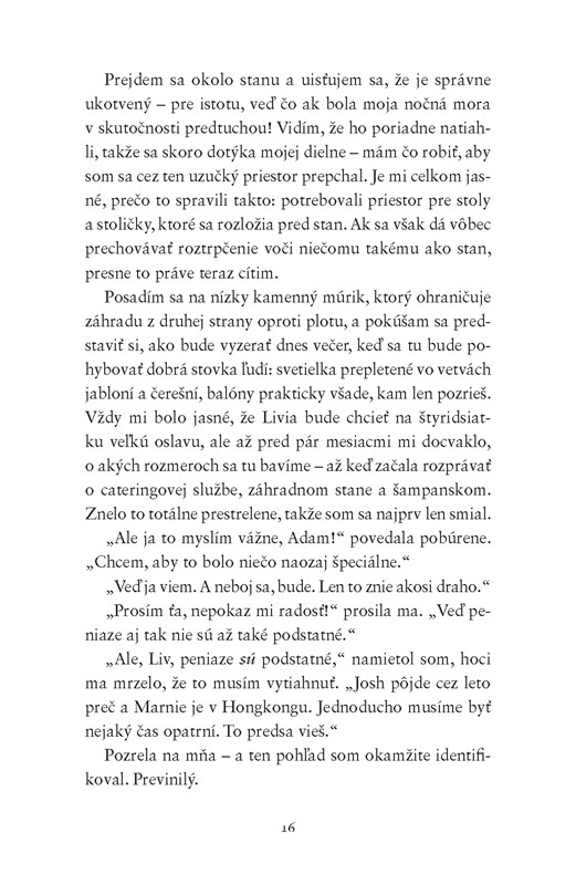 Livia oslavuje 40. narodeniny, a tak usporiada obrovskú párty s cieľom vynahradiť si svadbu, ktorú nikdy nemala. Príde každý, na kom jej záleží – okrem dcéry Marnie, ktorá študuje v zahraničí. A hoci Livia svoju dcéru ľúbi, v kútiku duše je rada, že na oslavu nepríde. Musí totiž o nej Adamovi čosi povedať, no plánuje s tým počkať až do konca párty, aby si ešte užili poslednú šťastnú chvíľku. Adam chce, aby bola Liviina oslava dokonalá, a tak potajomky zariadi, aby Marnie prišla a prekvapila ju. V priebehu dňa sa však dozvie strašné správy. Musí Livii povedať, čo sa stalo, za takýchto okolností predsa nemôžu ďalej oslavovať. Ale je taká šťastná – a hostia už prichádzajú…
