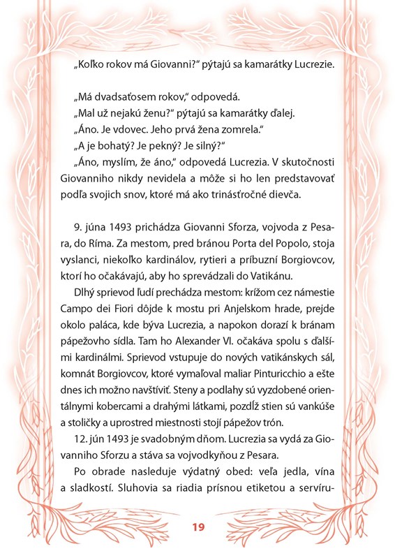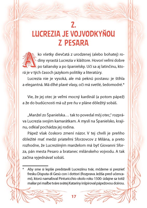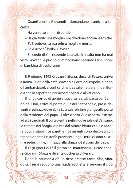 O pápežovi Borgiovi a jeho deťoch sa veľa hovorilo, a to už v časoch, keď boli všetci z nich ešte nažive. Vravelo sa toho toľko, že aj ich súčasníci len s námahou rozlišovali skutočnosť od predstáv, realitu od fantázie. A ešte v dnešných časoch sa ľudia stále radi pozastavujú nad najviac vzrušujúcimi a najkrutejšími stránkami ich životov. Príbeh, ktorý predstavujeme, je o Lucrezii, milovanej dcére pápeža, ktorá bola často len bábkou v hre mocného otca. Samozrejme mala svoje city a priania, vždy ich ale musela podriadiť záujmom Vatikánu a predovšetkým pápeža. Dcéry v tých časoch skrátka slúžili na to, aby vďaka vhodnému sobášu rozširovali vplyv a postavenie celej rodiny. Príbeh Lucrezie je napísaný zjednodušenou taliančinou tak, aby vyhovoval potrebám začínajúceho čitateľa. Na každej strane nájdete slovenský zrkadlový preklad, cvičenia na konci knihy sú vhodné na overenie získaných znalostí.