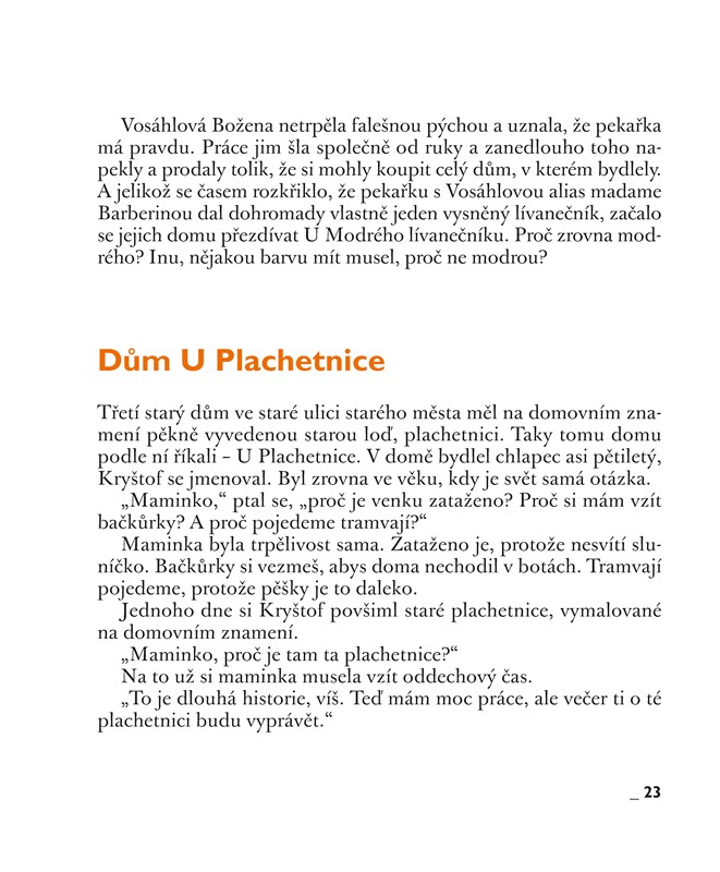 Víte, co jsou domovní znamení? Správně, ty hezké obrázky nebo sošky nad vchody domů. Ale jak se tam ocitly? Proč je někde postava, zvíře, nebo rostlina, jinde věc, a tamhle třeba planeta? O vzniku znamení v jedné staré ulici ve starém městě vyprávějí tyhle pohádky. Odhalí, jak vzniklo znamení Tří balonků, Modrého lívanečníku nebo Dvou hvězd. A co skrývá dům U Čerta a U Černého kuřete. I další domy – ten s krásnou plachetnicí či houpacím koníčkem nezůstanou bez povšimnutí. Jsou to příběhy vskutku neobyčejné!