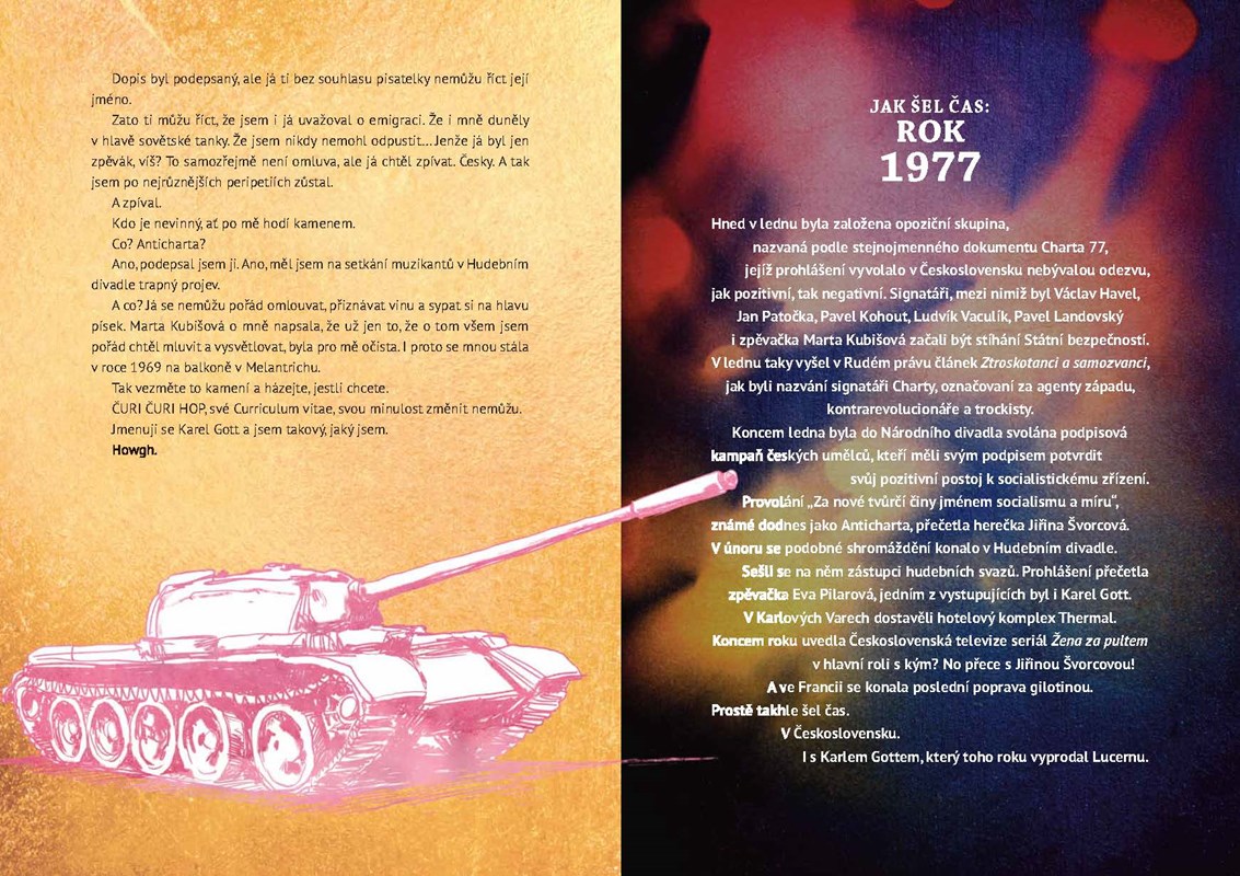 Nebylo, není a asi nikdy ani nebude slavnějšího českého zpěváka, než je Karel Gott. Tato kniha ovšem představuje božského Karla tak, jak ho zaručeně ještě neznáte. Z řady publikací, které o něm byly sepsány, vyčnívá právě tato kniha svým nápaditým provedením, které v sobě velmi organicky spojuje tradici a novátorské výtvarné pojetí. Je důstojným, a zároveň svébytným ohlédnutím za Gottovým životem, které zaujme nejen zpěvákovy fanoušky, ale i jejich potomky. Připomeňte si jeho začátky v Semaforu, nejlepší hity, slavné kolegy i všechny zpěvákovy ženy… Vraťte se s ním do uvolněných šedesátek, normalizovaných sedmdesátek, barevných osmdesátek i svobodných devadesátých let a prožijte svůj život s Gottem ještě jednou!