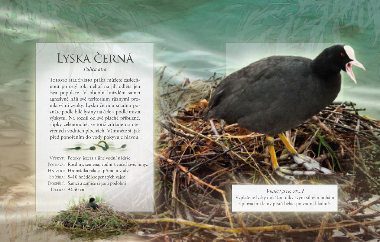 Ptáci mokřadů vydávají jedny z nejpozoruhodnějších ptačích zvuků – od tklivého volání kolihy až po troubivý zpěv jeřába. V knize ale nemůže chybět ani elegantní labuť, jejíž hlas možná děti překvapí. Tato knížka nás provede fascinujícím světem úzce spojeným s vodou a seznámí nás s ptactvem, které v těchto vlhkých oblastech volné přírody žije. Knížka spojující obrázky a zajímavosti se zvuky a třebas i hrou na jejich poznávání se může stát dalším kamarádem našich dětí a celé rodiny.