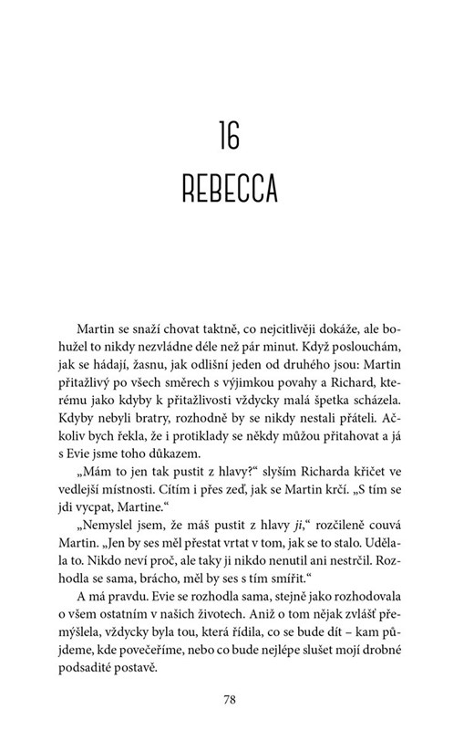 Odpověď na otázku, proč se krásná, bohatá a oblíbená Evie odhodlala k tak drastickému kroku, nehledá jen policie, ale především zdrcený Richard a Rebecca. Klíč k události se skrývá v Eviině minulosti. Je možné, že Evie nikdo z nich opravdu neznal? A kdo další, kromě mladé nevěsty, něco tají?
