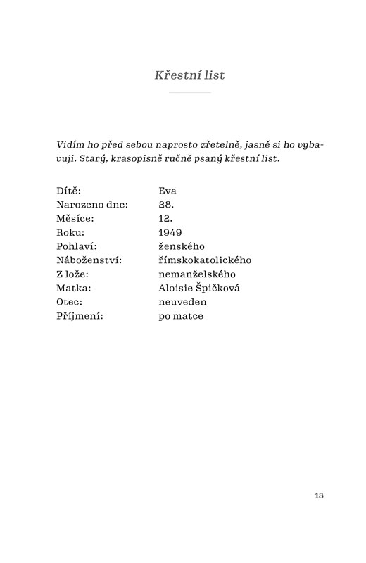 Když jí bylo šedesát, začala psát. Nevynechala nic. Dětství strávené v bídě, zoufalství a nedostatku lásky, putování po dětských domovech, ale ani roky, kdy hledala naději a nacházela vnitřní sílu. Autobiografický román Evy Vondráčkové vznikal deset let a vlastními komentáři ho doplnila dcera Daniela. Ze vzpomínek a dobových fotografií společně poskládaly zdánlivě malý, a přitom univerzální příběh jedné rodiny na pozadí českých moderních dějin.