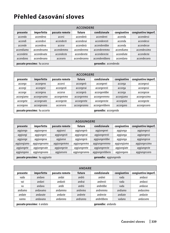 Na konci učebnice jsou zařazeny souhrnné abecedně řazené slovníky česko-italský a italsko-český, přehled časování sloves, přehled nejčastěji používaných předložek a předložkových výrazů a gramatika pro studenty, kteří si chtějí prohloubit svoje znalosti.