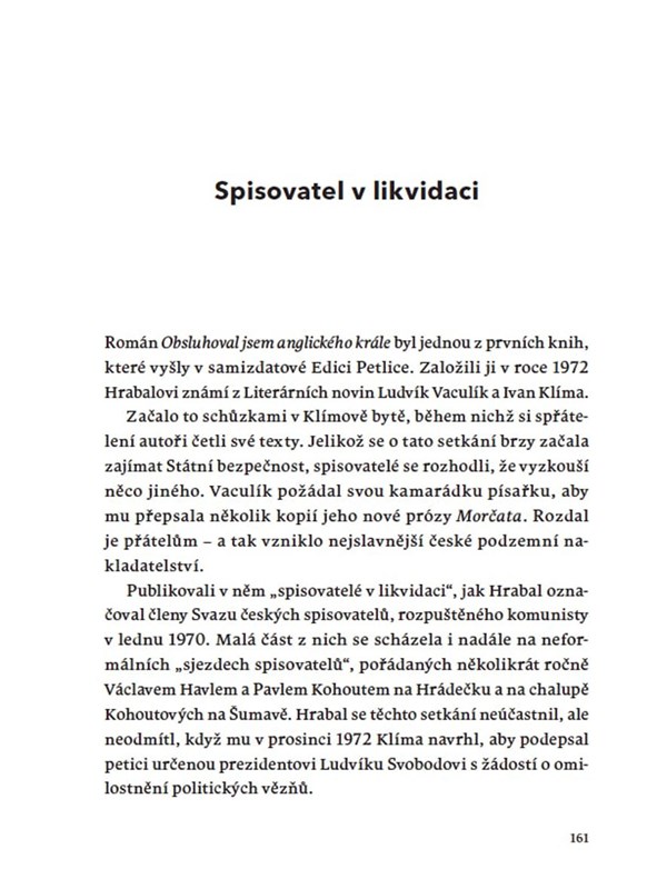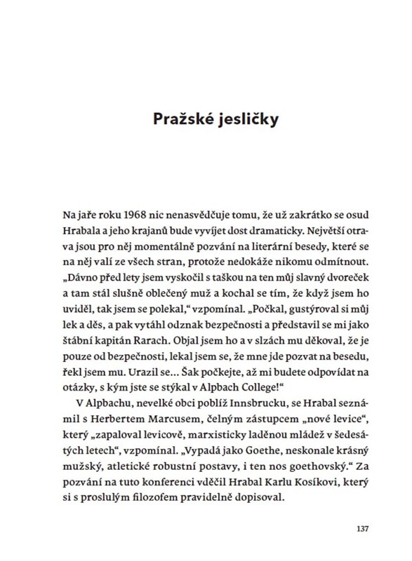 Bohumil Hrabal, mistr slova, scenárista Jiřího Menzela, spisovatel zbožňovaný Kunderou a Havlem, štamgast v hospodě U Zlatého tygra a plachý sukničkář. Samotář, záhadný i ve své tragické smrti. Aleksander Kaczorowski, polský bohemista, znalec a překladatel Hrabalova díla. Přátelé. Unikátní biografie připomíná Hrabalovu výjimečnou osobnost i dílo z mnoha neobvyklých perspektiv. Autor při práci využil řadu pozapomenutých zdrojů, které nepatří ke „kánonu“ Hrabalových textů, nechybí proto ani překvapivé či humorné momenty. Díky osobní známosti obou spisovatelů je navíc příběh doplněn historkami doslova z první ruky, a to i z méně známých životních etap Hrabalova života.