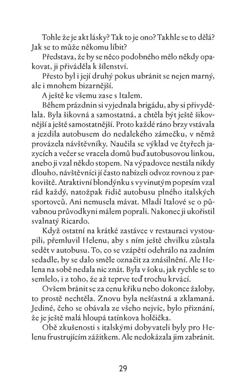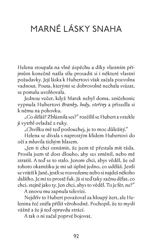 V příběhu temperamentní, atraktivní Heleny a jejího manželství autorka zachází do intimních i absurdních vztahových detailů a míchá pro čtenářky pikantní koktejl skutečných zážitků, nesplněných přání, útržků pravdy i bohapusté fikce. Knížku napsala jako jednu z možností, jak vyhrát tichý boj s vlastními myšlenkami, který většina žen svádí v dlouhodobém manželském soužití. Najde Helena východisko z neustálého kolotoče vztahových vzestupů a pádů? Komu má být věrná? Sobě, nebo manželovi?