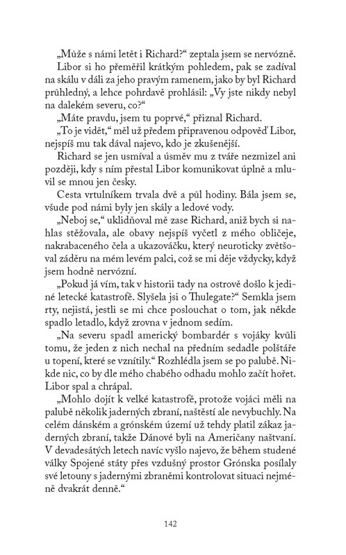 Co se stane, když se žena kvůli svému muži přestěhuje do Grónska a on jí k narozeninám věnuje plavbu s partou zbohatlíků na severní pól? A co když si vědec z Ruska vypůjčí zdánlivě nepotřebnou knihu, kterou už nikdy nevrátí? A co teprve, když jediný muž, který o vás na ostrově uprostřed ledu a mrazu jeví opravdový zájem, je šedesátník s revolverem u pasu? Nakonec se rozvedete. Ale to dobrodružství za to stojí!