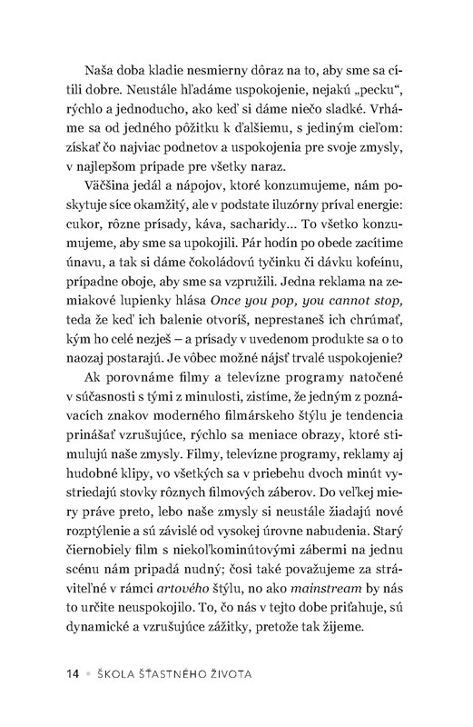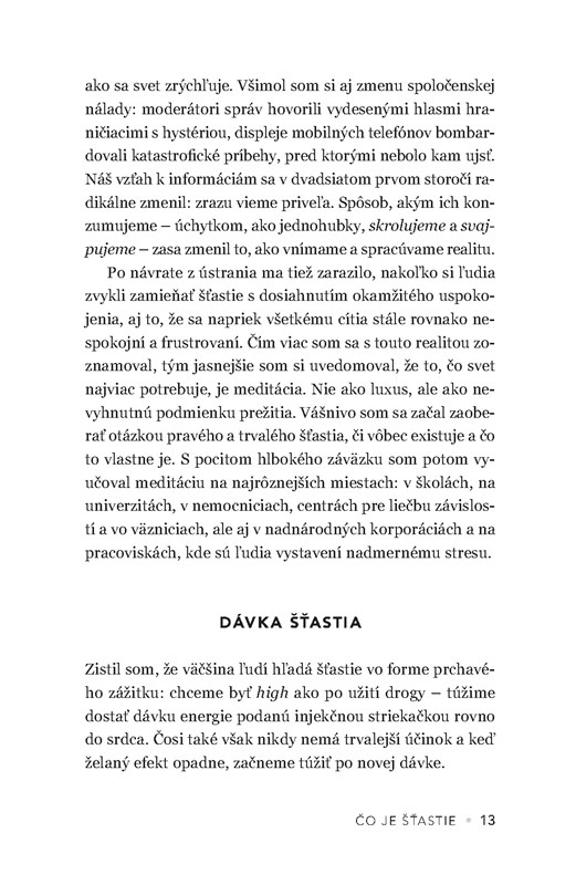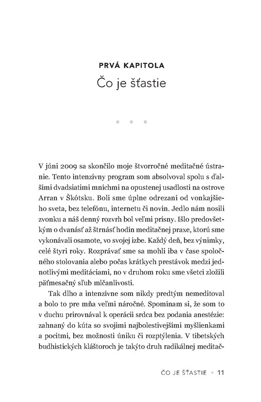Ale späť ku knihe. Túto my ľudia doby súčasnej bytostne potrebujeme. Gelong, ktorý sa stal z herca mníchom a meditáciami strávi doslova roky (akože vkuse, štyri roky v ústraní, sám so sebou, hodiny meditujúc) vám vysvetlí, že naučiť sa tomuto umeniu je základ pre (znovu)nastolenie vnútorného pokoja a vypnutie toho bzukotu. Že nikdy sme to nepotrebovali viac. Vyvracia mylné predstavy o tom, čo to tá meditácia je. Neodkväcnete po nej, ani nebudete neznesiteľne predchnutý levitujúci vesmírny superpohoďák. Páči sa mi jeho prirovnanie, že je to ako stáť pri ceste. Sledujete autá, občas do nejakého nastúpite, ale neviete, kam vás unesie. S meditáciou budete schopní autá - vaše myšlienky - len pokojne sledovať bez toho, aby ste do niektorého skákali. Wau, toto fakt potrebujem vedieť.