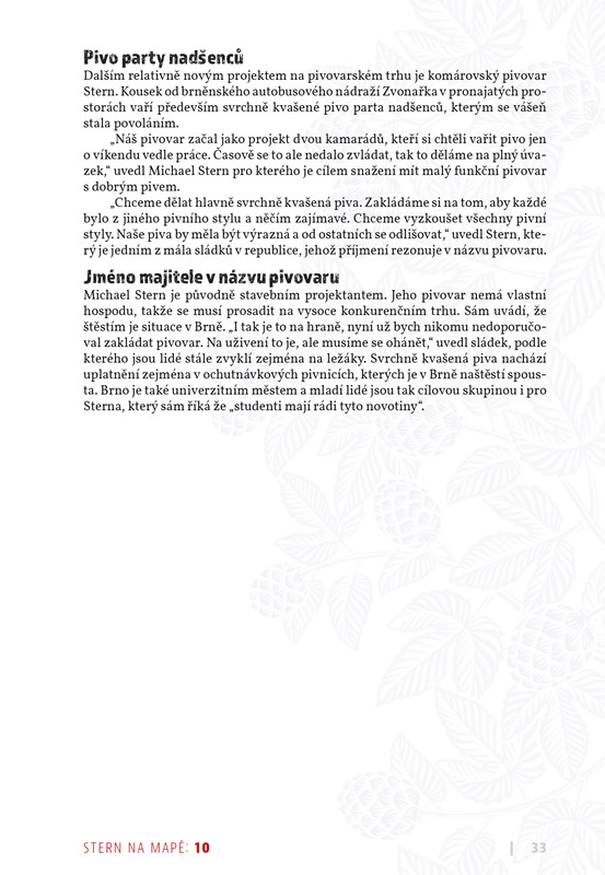 Popularita obou těchto nápojů se přitom doplňuje, o čemž vypovídají i příběhy sládků v této knize. Mimořádný rozvoj minipivovarů je reakcí na globalizaci oboru, řemeslná piva konzumentům nabízí alternativu, kterou zejména mladší generace kvitují s povděkem. Tak se nechte provázet jednotlivými místy a zapojte i svoje chuťové pohárky. Dej Bůh štěstí, ať tento pozitivní trend vydrží co nejdéle.
