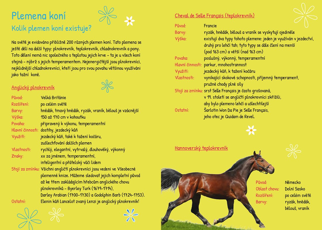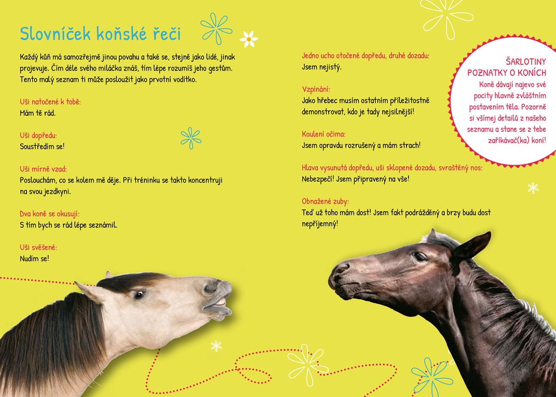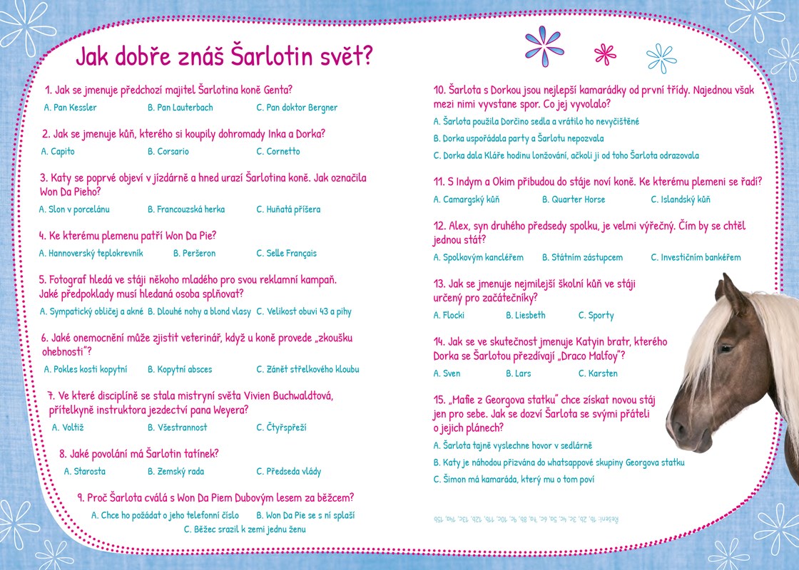 Nabídne ti nejen prostor pro osobní zápisky, ale také spoustu praktických a zajímavých informací o chovu či výcviku koní nebo napínavý kvíz. Blíže také poznáš hlavní hrdinky z knižních sérií o Šarlotě a Eleně.