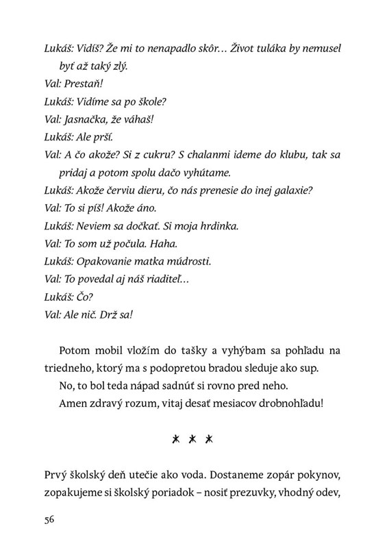 Val žije dvojí život. Ten ozajstný, kde prázdniny trávi so sadrou na nohe, zbožňuje svojich dvoch najlepších kamošov Lukáša a Didu a doma má blázinec. A ten virtuálny, kde postuje príspevky a dáva potajme otázky, na ktoré túži poznať odpoveď no bojí sa opýtať priamo.