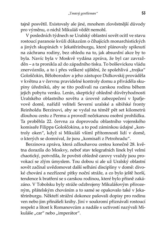 „Bylo zhruba 2:15 ráno, když Jurovskij a Nikulin, za doprovodu dvou příslušníků vnitřní stráže s puškami, vedli rodinu v pološeru dolů po prudkých, úzkých schodech do přízemí. Romanovci se instinktivně seřadili podle zautomatizované přednosti v pořadí, v čele šel car, odmítající jakoukoliv pomoc, přestože zápasil s tíhou Alexeje, jenž sebou trhal bolestí obvázané nohy…“