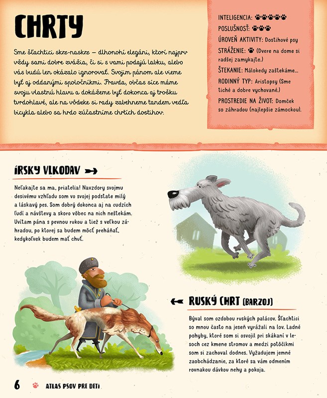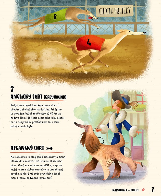 V úvode sa deti dozvedia základné fakty o psíkoch. Najviac ich podľa mňa zaujme prevodník psích rokov na ľudské. Ja som hneď rátala, koľko má naša retríverka. Ďalej sa kniha venuje jednotlivým plemenám. Od chrtov cez stavače až po jazvečíky. Nájdete tu všetky známe aj menej známe rasy.