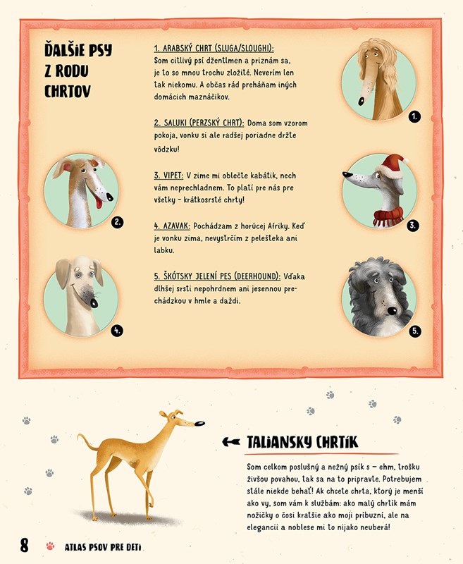 Ja som niektoré vôbec nepoznala. Tak napríklad: vedeli ste, že existuje vydrí pes, ktorý má medzi prstami plávacie blany? Ja teda nie. Alebo viete, ktorý psík kedysi dávno zahrieval skrehnuté nohy šľachticom a šľachtičnám? Bol to francúzsky bišon. Hoci vyzerá ako plyšová hračka, hračka určite nie je. Takýchto informácií je v knihe neúrekom. Možno si najskôr prečítate iba o psíkovi, ktorého máte doma alebo ktorého poznáte. Postupne však určite bude deti zaujímať viac a viac. Texty sú písané veľmi hravou formou a určite zaujmú. Veď o sebe rozprávajú samotní psíkovia. My sme napríklad hľadali psíkov, okolo ktorých chodievame na prechádzke.Každé plemeno má pri sebe aj malú tabuľku. V nej nájdete inteligenciu, poslušnosť, úroveň aktivity, stráženie či štekanie. Navyše sa dozviete, či je vhodné k deťom a aký domov bude preň ideálny. Táto tabuľka môže pomôcť pri výbere psíka, pokiaľ o ňom uvažujete. Kniha však nie je iba o plemenách. Nachádza sa v nej aj denník Psie listy. V ňom nájdete rôzne príbehy, udalosti, ktoré sa stali, alebo aj rozhovory so psíkmi. Táto časť je skvelá na večerné čítanie. Príbehy sú milé, láskavé, vtipné. V závere nájdete psích rekordmanov. Nechýba ani niekoľko rád, ako sa o psíka starať a malý slovníček psej reči. Ten je skvelou ukážkou, ako sa psík správa. Deťom treba vysvetliť, že nie každý pes sa s nimi chce hrať. Možno vďaka kresbám pochopia, kedy im hrozí nebezpečenstvo, alebo kedy sa chce s nimi psík iba hrať. Kresby v knihe sú naozaj krásne. Veselé, hravé a každého psíka máte chuť pohladkať. Atlas psov pre deti je skvelou voľbou pre malých milovníkov psov. Či už psíka máte alebo nie, deti sa o tomto zvieratku dozvedia veľa zaujímavých informácií. Krásne ilustrácie vás prevedú všetkými možnými plemenami. Kniha je určená pre deti od šesť rokov. Vekovo kniha určite sedí. Príbehy, ktoré sú v nej, môžu zaujať aj mladšie deti. Napríklad ako čítanie pred spaním. Nášho trojročného Mateja zaujala už teraz.