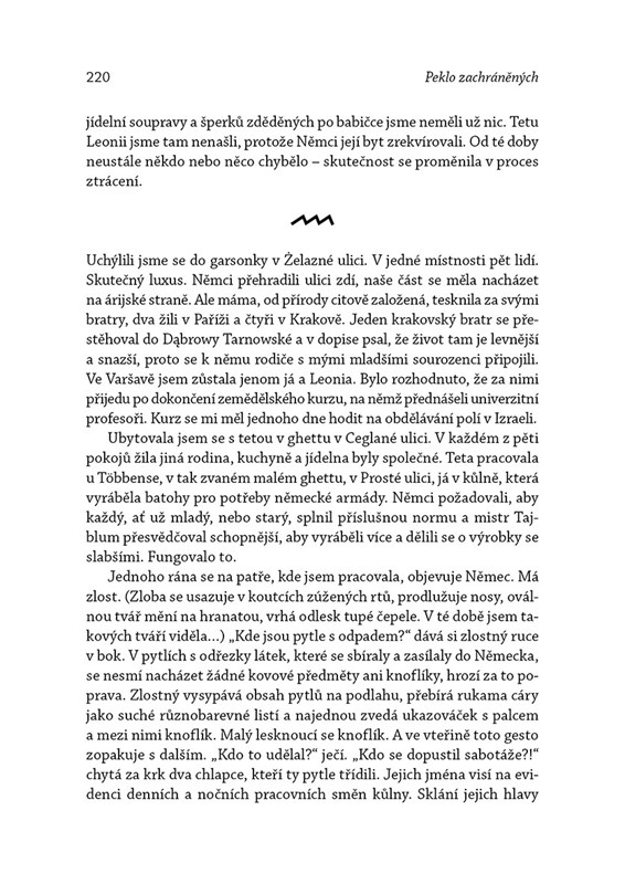 „Před večerem mám ghetto opustit dírou v plotě, pak si stáhnout pásku s Davidovou hvězdou a jít na vlakové nádraží. Při loučení mi Sonia nařizuje jít rychle, neohlížet se, ale já se otáčím a hned pochopím, před čím mě chtěla ochránit. Můj poslední obraz ghetta je budova ozdobená třinácti mrtvolami – toho dne pověsili celý Judenrat.“