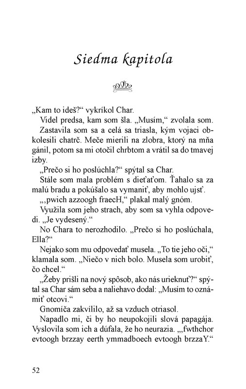 A tak ak jej niekto prikáže skákať celý deň na jednej nohe, musí to urobiť. Ak by jej rozkázali skočiť z okna, nedokázala by tomu zabrániť. Je v neustálom nebezpečenstve. Žije totiž s macochou a dvomi zlomyseľnými nevlastnými sestrami. Jediný, kto to dokáže napraviť, je Lucinda. Ella na ceste za svojou záchranou stretne obrov, víly... A možno aj princa. Bude mať aj tento príbeh svoje „... a žili šťastne až naveky“?