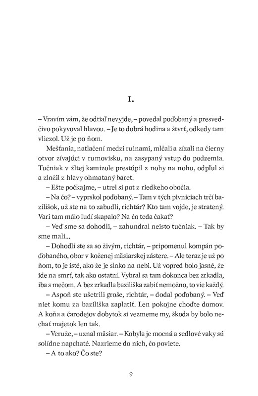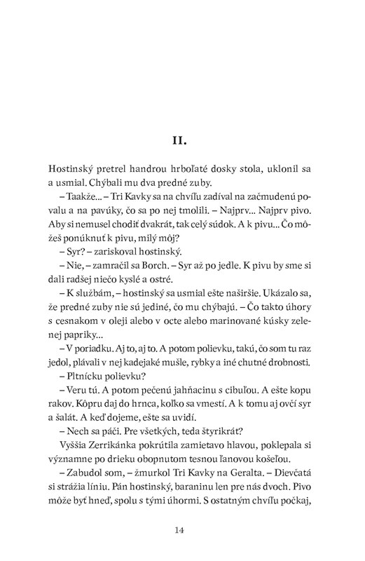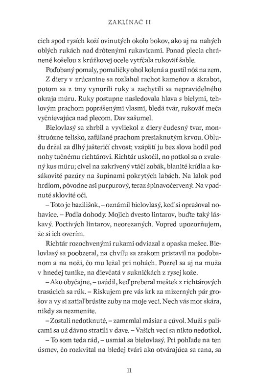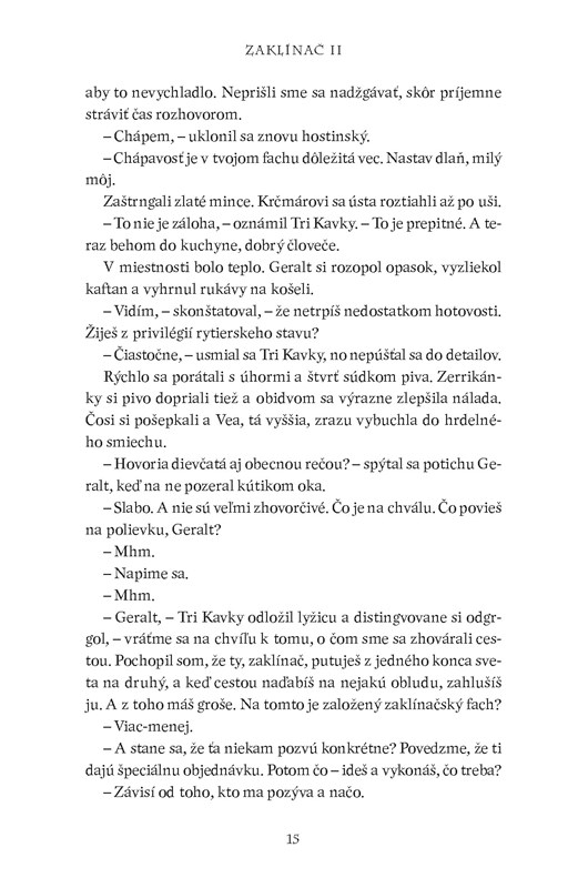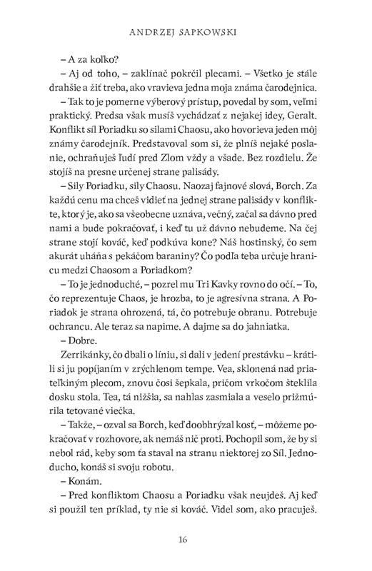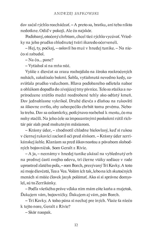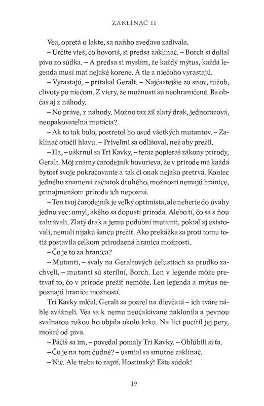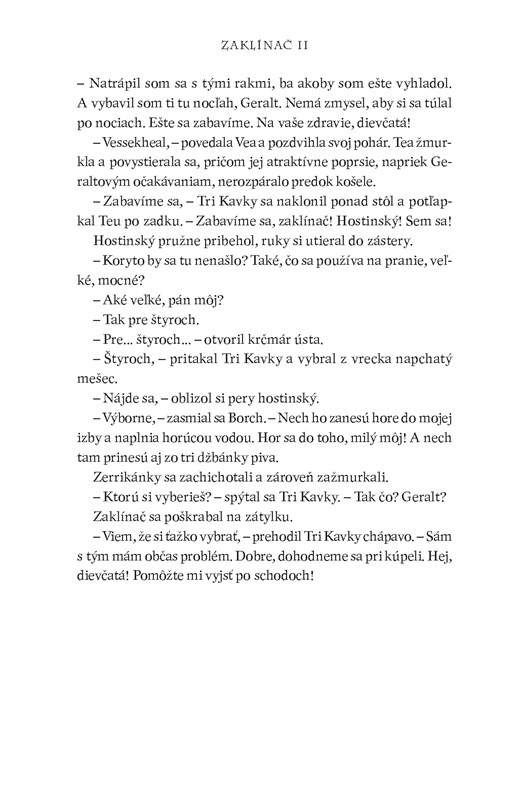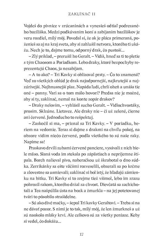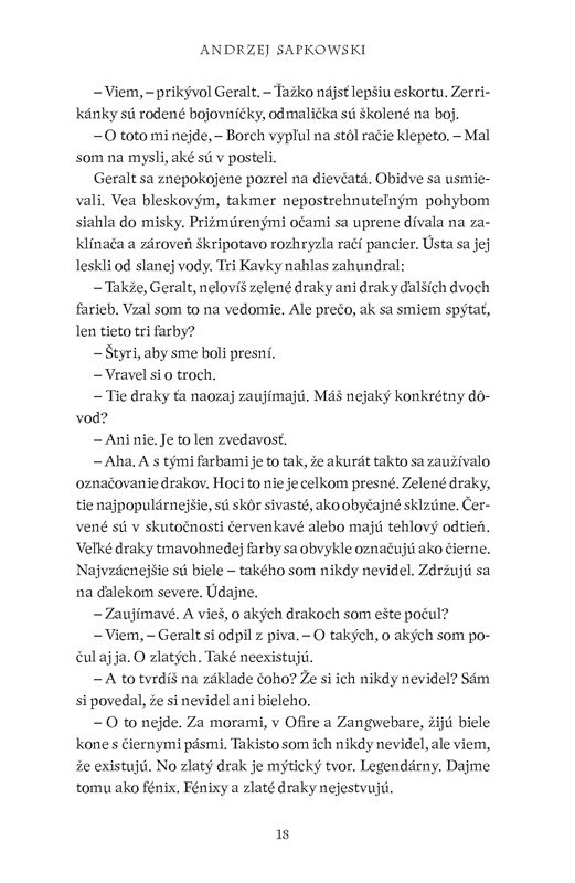 ,, Draky nelovím, – vyhlásil sucho Geralt. – Vidlochvostáky, prosím. Sklzúne. Lietavce. Ale draky nie, či už zelené čierne ani červené. Rešpektuj to."