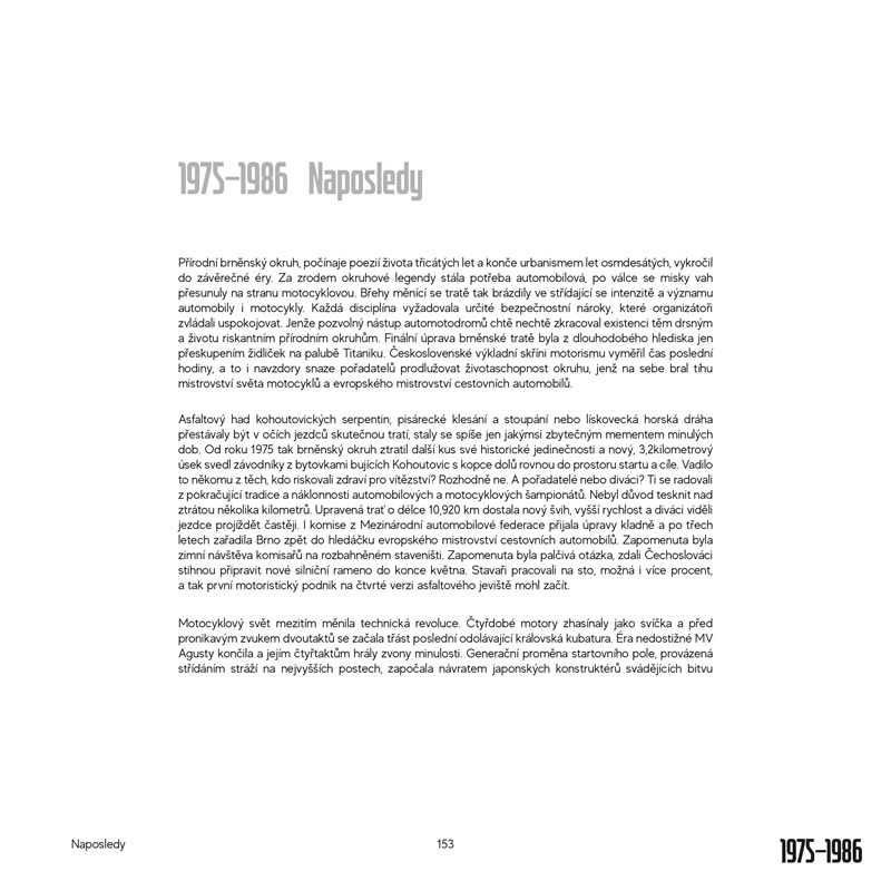 Masarykův okruh, jenž loni oslavil 90 let, byl palácem motoristické fantazie a osudů. Současný automotodrom nebo původní přírodní trať se svými různě dlouhými variacemi byli jevištěm excelentních jezdců předvádějící své umění vděčným divákům. Masarykův okruh je pojem světového motorsportu a zná jej každý fanoušek, ať už jedné či dvou stop. Tato výjimečná publikace vypráví jeho historii prostřednictvím jedinečných fotografií a příběhů lidí na nich.