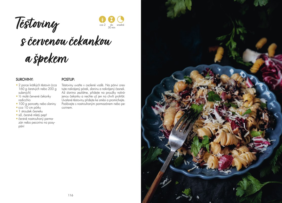 Jsou zde recepty na těstovinové saláty a polévky, gnocchi, kuskus, těstoviny s masem, rybou či uzeninou, celá řada omáček, polévky s těstovinami. Autorka nezapomíná ani na vegetariány, takže celá jedna kapitola obsahuje bezmasé recepty.