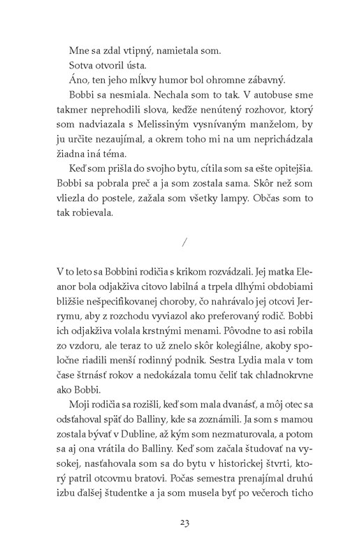 Inteligentný debut od autorky oceňovaného románu Normálni ľudia je neobyčajným príbehom o netradičných podobách ľúbostných vzťahov a ich dôsledkoch, o nežnosti, krutosti, vyrovnávaní sa so zložitosťou života a citovom dozrievaní.