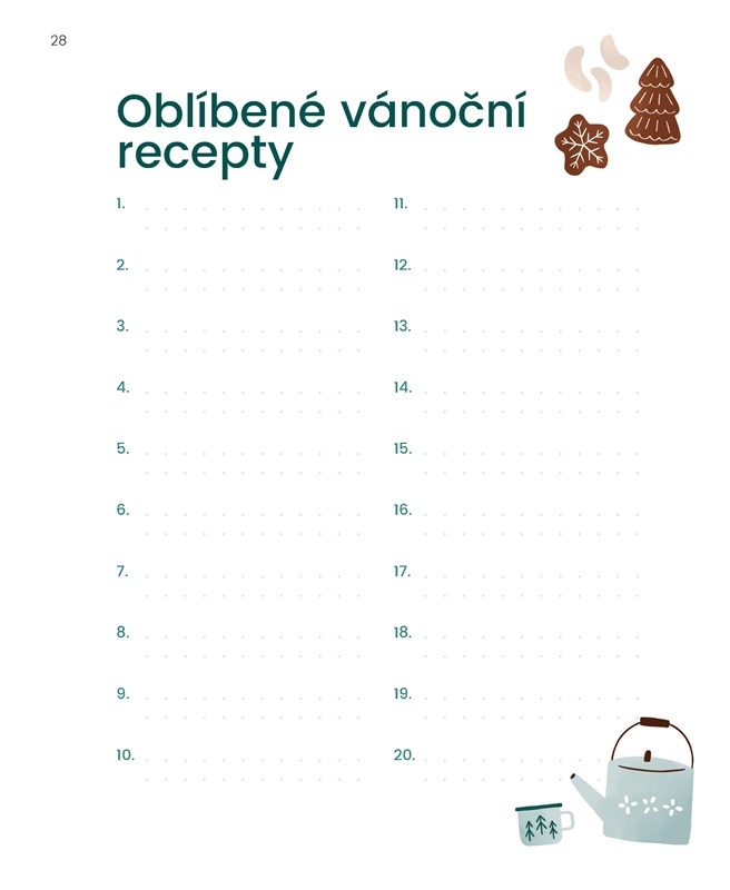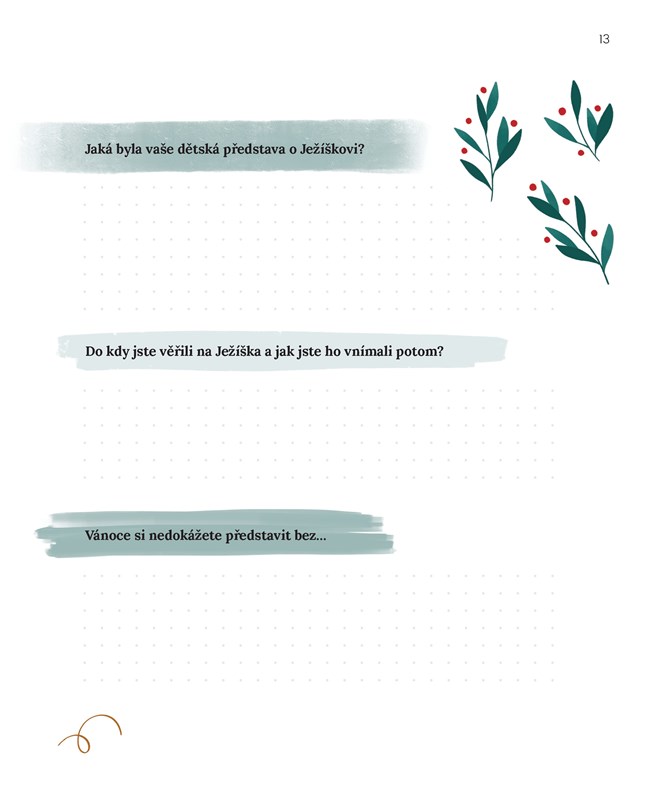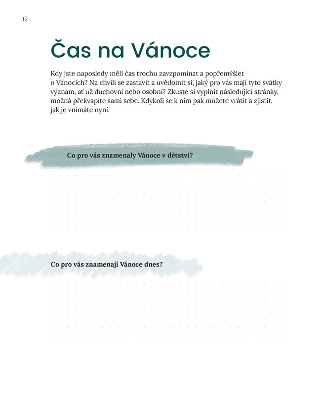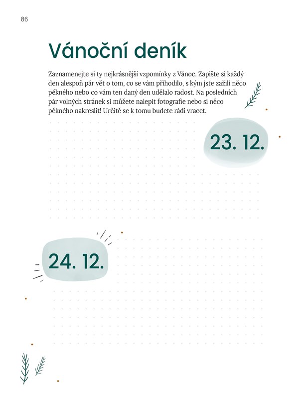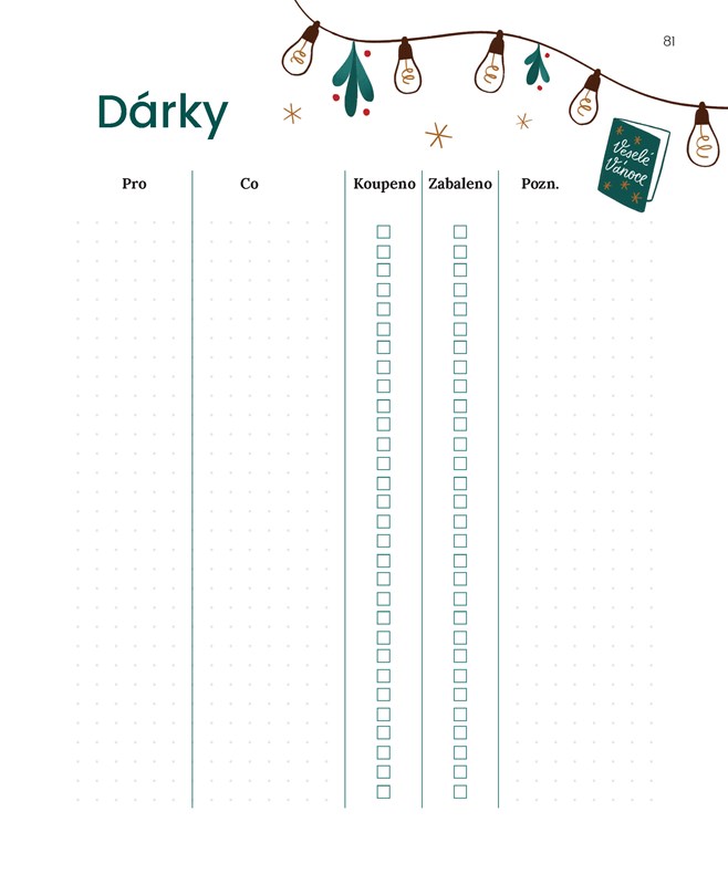 V knize najdete nejen užitečné seznamy a to-do listy, ale poradí vám i s vánočním rozpočtem, připomene české tradice, ukáže, jak stylově zabalit dárky, a pomůže vám zaznamenat ty nejkrásnější momenty, které si tak budete moci uchovat i do budoucna.
