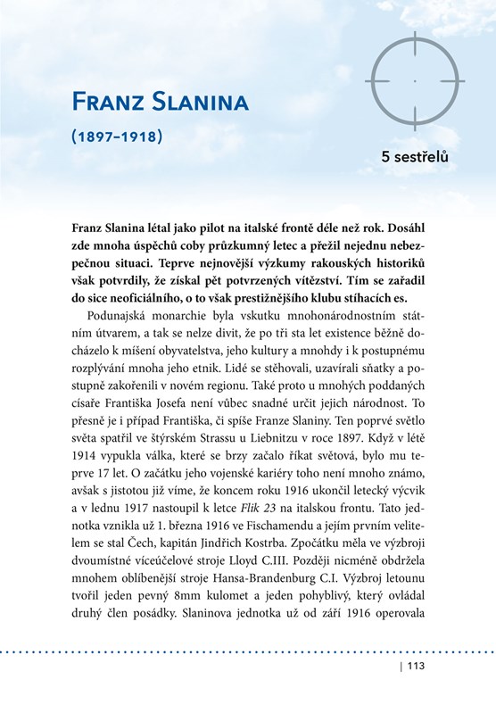 Během první světové války se zrodil pojem „stíhací eso“. Byl jím označován letec, který dokázal sestřelit pět a více nepřátelských letadel. Šlo sice o neoficiální, zato však velmi ceněný titul – snad každý pilot se jím toužil stát. Do konce Velké války se mezi esa zařadili celkem čtyři čeští piloti létající v řadách rakousko-uherského letectva. Konkrétně se jednalo o Ottu Jindru, Jindřicha Kostrbu, Augustina Nováka a Josefa Nováka; za Čecha bývá označován také František, či spíše Franz, Slanina. Každý z těchto mužů byl velice barvitou osobností. A právě těmto úspěšným letcům je věnována kniha, kterou nyní držíte v rukách. Norbert a Marek Brzkovští, již zkušení autoři na poli dějin válečného letectva, se svým novým dílem pokusili vzdát hold těm, kteří byli dlouhá desetiletí opomíjeni – jen proto, že bojovali za „špatnou“ stranu. I těmto skvělým letcům však patří naše uznání.