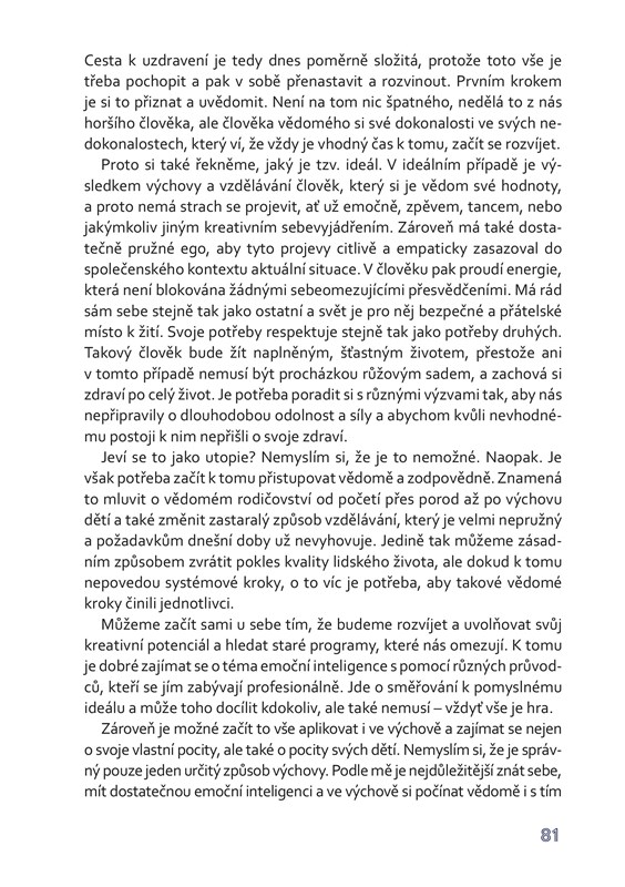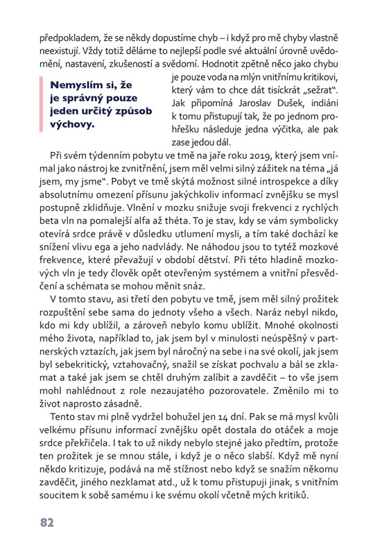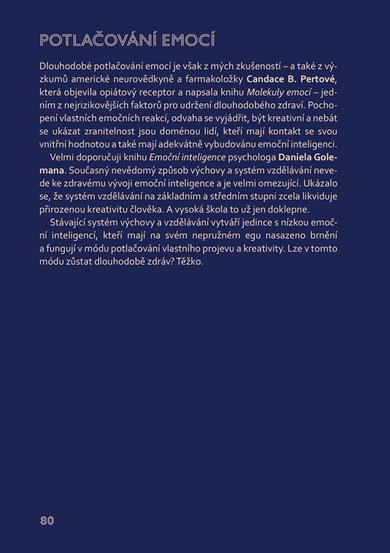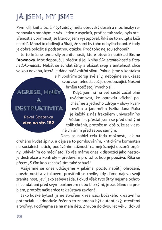 Spolu s ním nás na této cestě bude doprovázet i řada dalších osobností, které Jana Vojáčka ovlivnily – přečteme si řadu nesmírně zajímavých informací například z oblasti homeopatie, non toxic životního stylu, budování systemických konstelací, žití v přítomném okamžiku či naturopatie. Dozvíme se, jak nás ovlivňuje světlo, jak zvládat agresi a hněv, co je to egodiagram, jak na nás působí vztahy s nejbližšími či jak zharmonizovat svůj mozek.
