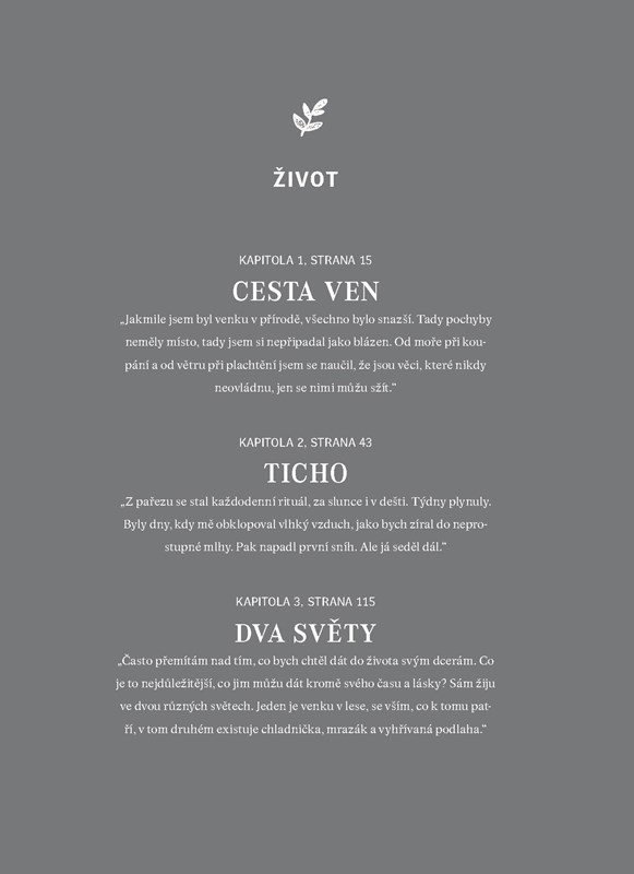 V knize se s námi dělí o osobní zážitky, ale i o řadu praktických návodů, třeba jak šplhat na stromy, jak si postavit postel venku anebo čím se v lese utřít… Především ale o to, jak uklidňující účinek má na člověka život v těsném spojení s přírodou.