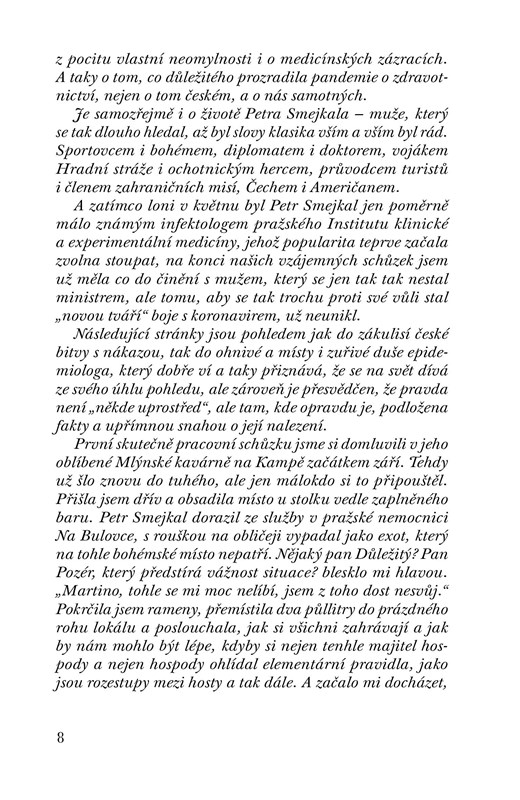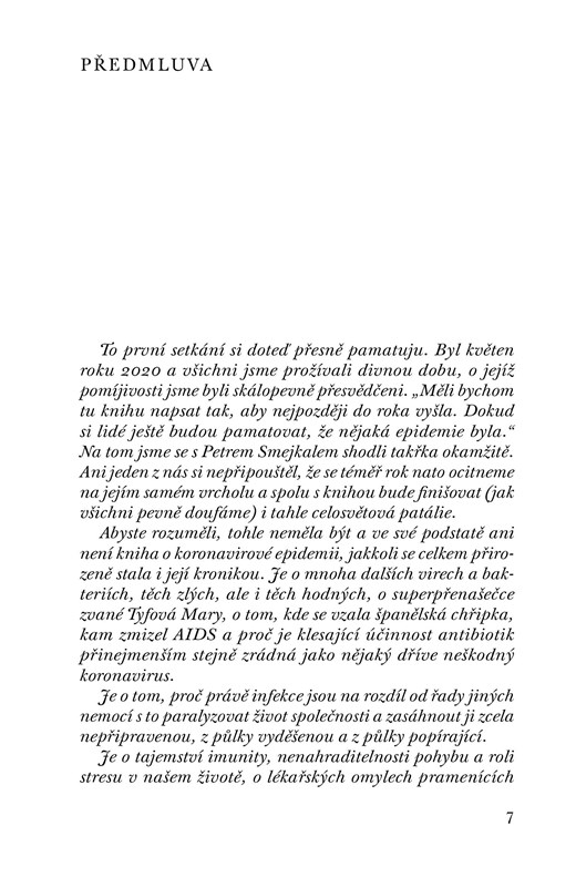 Knižní rozhovor známé novinářky Martiny Riebauerové s populárním lékařem, hlavním epidemiologem IKEM Petrem Smejkalem, o neviditelných spolubydlících na naší planetě: o virech a bakteriích, které jsou základní stavební jednotkou života na Zemi. O tom, kdy jsou pro nás nebezpečné a kdy naopak prospěšné. O velkých epidemiích historie i o tom, proč jsou zbraně mikrobů tak zákeřné a zda medicína vůbec může mít účinnější. Rozhovor, který vznikal od podzimu 2020 do února 2021, se zároveň stal kronikou současné koronavirové epidemie tak, jak ji oba aktéři denně prožívali.