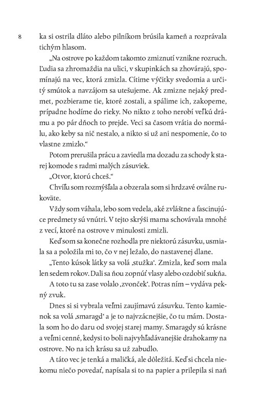 Na bezmennom ostrove pri bezmennom pobreží miznú objekty: najskôr klobúky, potom stuhy, vtáky, ruže. Väčšina obyvateľov ostrova na stratené predmety okamžite zabúda, akoby im ktosi vygumoval spomienky. Lenže tí, čo neprišli o schopnosť pamätať si, žijú v ustavičnom strachu. Pátra po nich pamäťová polícia, ktorá má za úlohu zabezpečiť, aby to, čo zmizlo, upadlo navždy do zabudnutia.