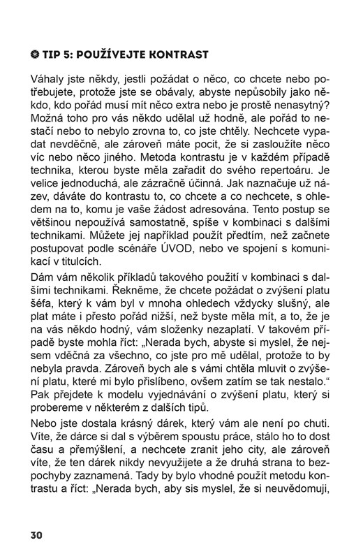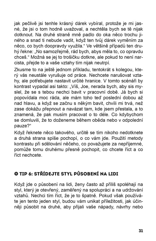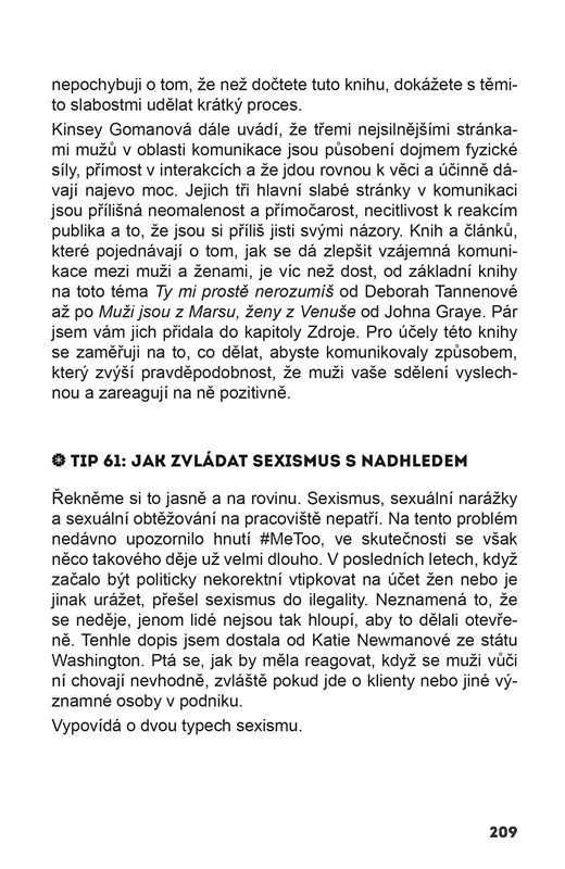 Odpověď je jednoduchá: protože jste hodná holka, která jde s proudem, aby zapadla. Ale zůstat potichu a být ignorována není cesta k úspěchu. Tahle knížka vám pomůže komunikovat v práci sebevědomě, odvážně, jasně – a zároveň diplomaticky. Každé pracoviště je totiž plné nášlapných min, dilemat a potenciálně ožehavých situací. Dlouhodobý úspěch závisí na tom, jestli je všechny dokážete zvládat taktně.