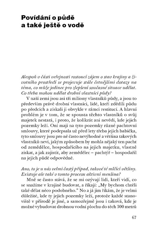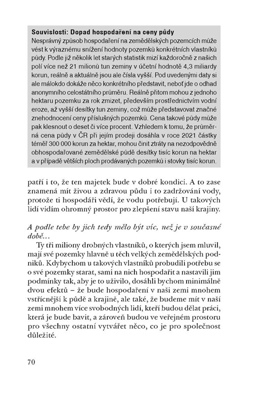 Mezi nejznámější české soukromé zemědělce patří „sedlák pod Milešovkou“ Daniel Pitek. Zemědělec, lesník, politik a aktivní, angažovaný občan neúnavně přitahuje pozornost veřejnosti k otázkám trvale udržitelného hospodaření, stavu českých lesů, zadržování vody v krajině a dalším, stále palčivěji vnímaným problémům. V rozhovoru s novinářem Petrem Havlem se věnuje změnám na našem venkově po roce 1989 a pojetí zemědělského hospodaření v polistopadovém období. Jak se v ČR žije a podniká soukromým zemědělcům a jak zlepšit jejich podmínky? Jak chránit kvalitu půdy a zdroje vody a jak reagovat na projevy klimatické změny? Jak nakládat s biomasou a co si pod tímto pojmem vůbec představit? Na tyto a další velice aktuální otázky přináší kniha odpovědi založené a vyzkoušené vlastní zkušeností. Další pomocí pro čtenáře jsou vysvětlení některých běžných, a přece nedostatečně dobře chápaných pojmů z oblasti zemědělství, lesnictví i ochrany přírody.