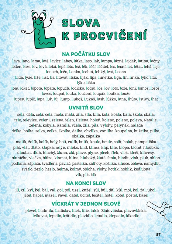 * Slova k procvičení – řady slov, kde je hláska na začátku, uprostřed a na konci slov. Opakování slov pomůže při upevnění hlásky.