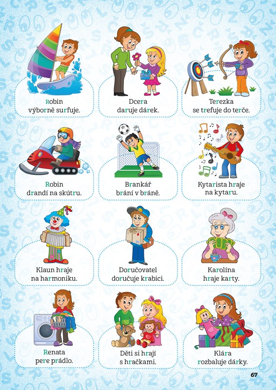 * Co kdo dělá – procvičování hlásky zařazené do vět doplněných obrázkem. Věty nejprve opakujte, potom můžete popsat obrázky a povídat si o zkušenostech s danou činností