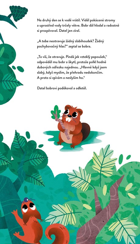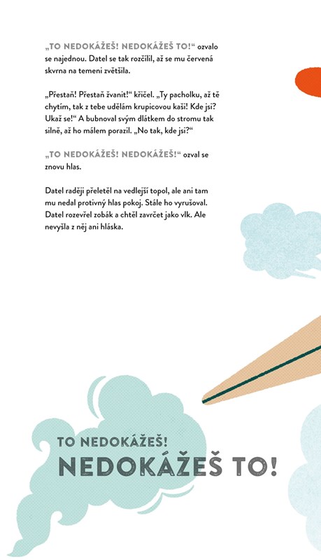 Ťuk, ťuk, ťuk! Kdo to je? Veselý datel klove do stromu. Dělá si nové hnízdo v dutině stromu. Proč ale přestává? Slabý hlásek uvnitř jeho hlavy mu našeptává, že svoje hnízdo nikdy nedokončí. Dokáže se datel postavit věčně pochybovačnému slabihoudkovi? Dojemný příběh o tom, že pochybností se nedá zbavit, ale dá se jim úspěšně čelit, pokud člověk ví, jak na to.