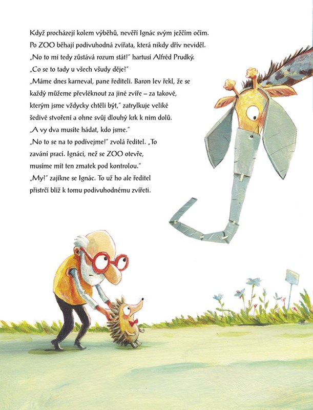 O ředitele zoo Alfréda Prudkého se pokoušejí mrákoty. Kam se poděli hroši, zebry nebo opice? Místo nich se to tady hemží prapodivnými stvořeními. Opravdu kolem něj prošel slomelák a žirafon? Naštěstí je tu Alfrédův kamarád ježek Ignác, který s fištrónem sobě vlastním pomůže řediteli tuto karnevalovou hádanku rozluštit. Pomůžete mu odhalit, kdo je kdo? Vždyť brány zoo se otevřou už za pár hodin!