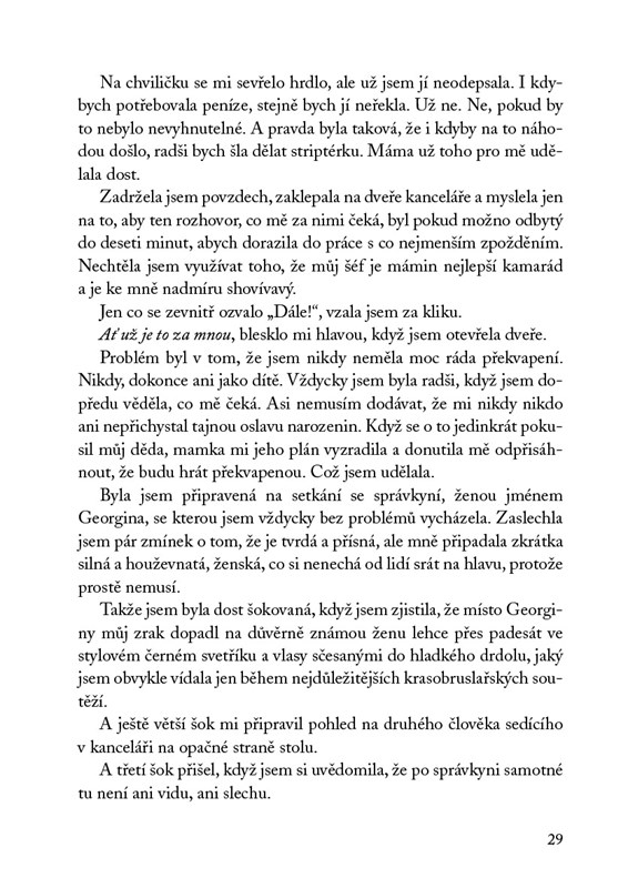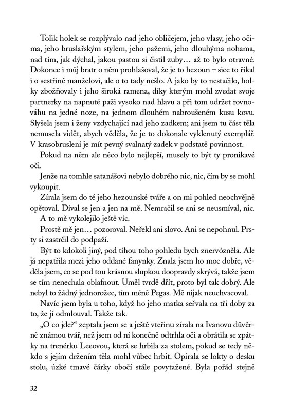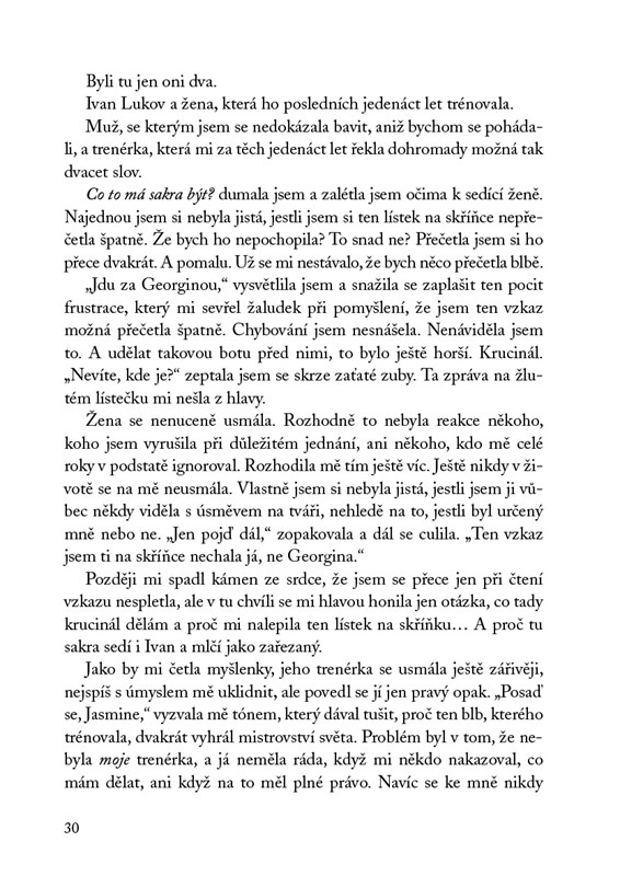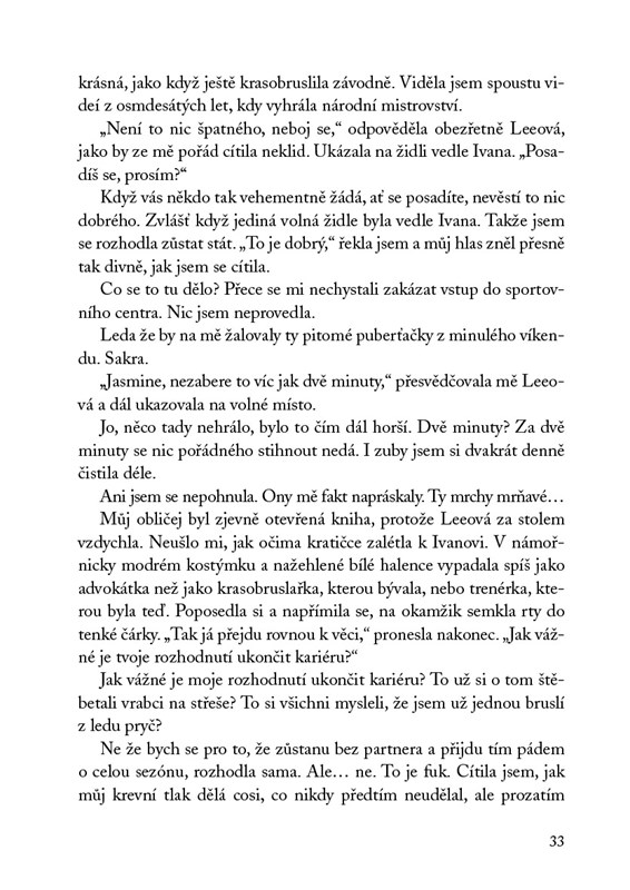 Kdyby někdo požádal Jasmine Santosovou, aby popsala posledních pár roků svého života jediným slovem, určitě by bylo neslušné. Po sedmnácti letech, bezpočtu zlomených kostí a hoře nesplněných slibů tuší, že se její kariéra krasobruslařky chýlí ke konci. Pak ale přijde nabídka od člověka, kterého si posledních deset let představovala padat pod kola rozjetého autobusu. Možná není pozdě některé věci ještě přehodnotit. Včetně názoru na arogantního idiota Ivana Lukova.