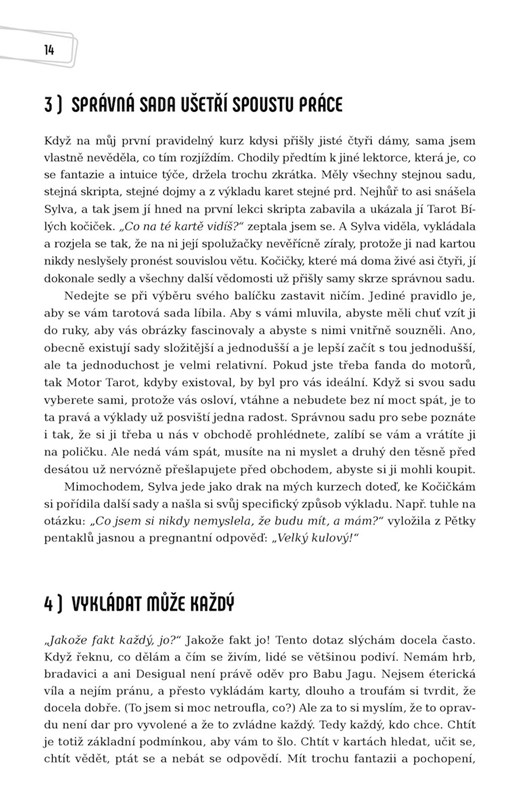 Máte čas? A máte čas na tarot? Když si totiž uděláte čas na tarot, uděláte si ho i na sebe. A o to tu hlavně jde. V tom je jeho kouzlo, poslání a smysl. Držíte v rukou sto jedenáct praktických, hravých a jednoduchých tipů, jak si karty vyložit, na co se zaměřit, když je vykládáte někomu jinému, a mnoho jiných témat, která při výkladu chtě nechtě vylézají na povrch. Vše vlastní hlavou vymyšleno, opřeno o znalosti učitelů, neustále zkoušeno na lidech (i na zvířatech) a předáno tak, aby se to dalo nejen číst, ale i dělat. Hlavně dělat.