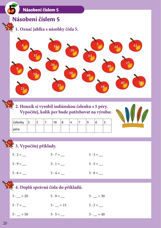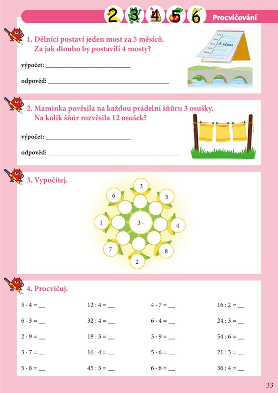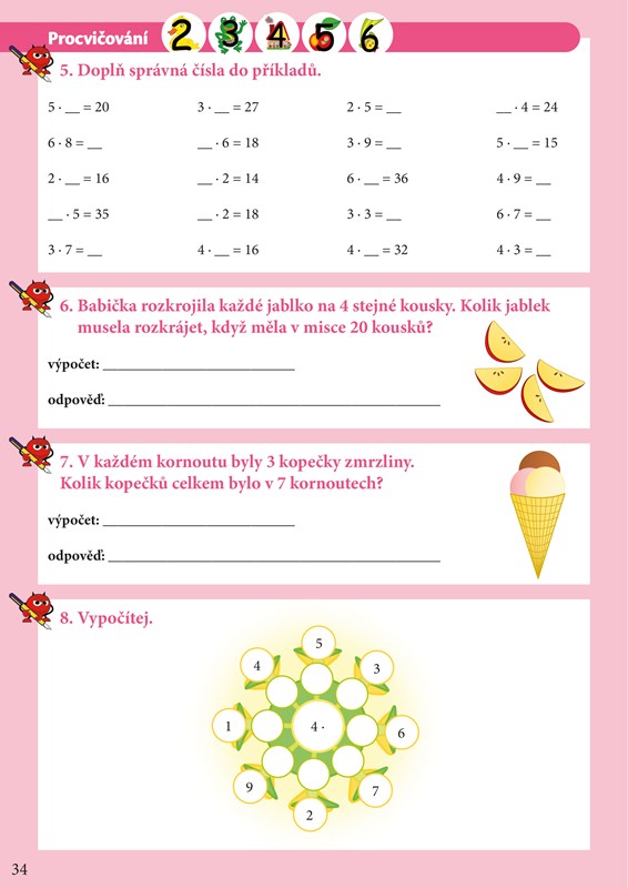Čertík Kvítko použil pár triků a vyčaroval kouzelné karty, se kterými se naučíte malou násobilku pekelně snadno. Karty najdete jako přílohu této cvičebnice, stačí je jen vystřihnout a učení pro vás bude hračka. Každý příklad je vlastně kratičký příběh: Číslicím od jedné do desíti je vždy přiřazen jeden obrázek a výsledek je namalovaný na druhé straně jako jeho kratičké dokončení. Stačí, když budete karty postupně procházet a ty, které si ještě nepamatujete, odložíte stranou a později se k nim ještě jednou nebo vícekrát vrátíte.