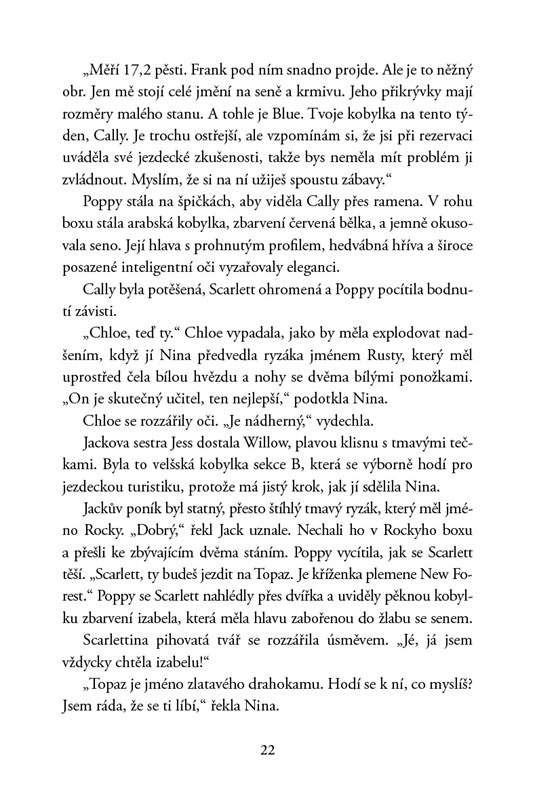 Pro Poppy měl být týden na koních uprostřed nádherných lesů životním zážitkem. Když jí přidělí ošklivého a tvrdohlavého poníka jménem Elegán, její nadšení se vytratí. Špatnou náladu jí nezlepší ani hloupá hádka se Scarlet, která zasadí vážnou ránu jejich přátelství. Starosti jí dělá i podezřelý muž, který se potlouká kolem stájí. Dřív, než Poppy přijde na to, co tam pohledává, strhne se prudká bouře, která začne ohrožovat všechny koně. Poppy ví, jak stáje zachránit, k tomu však potřebuje pomoc svéhlavého Elegána. Dokáže vyhrát závod s časem? A zůstanou se Scarlett nejlepší kamarádky?