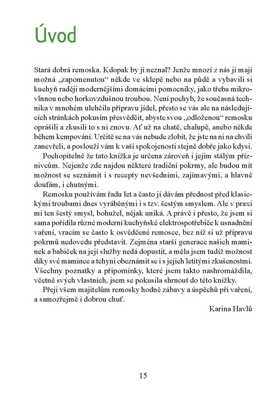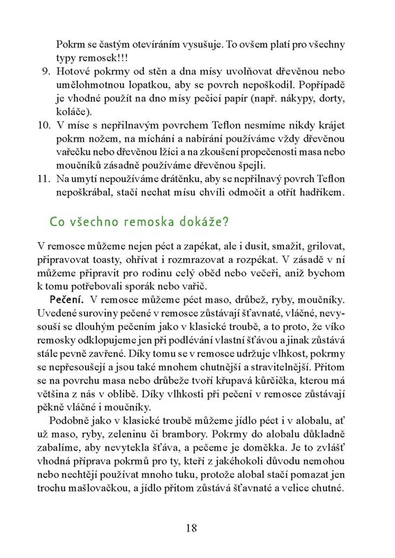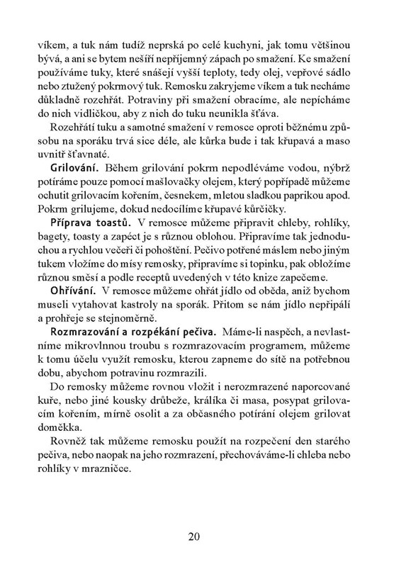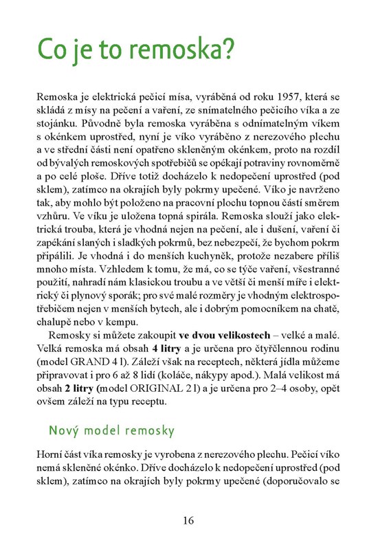 Nechcete trávit příliš mnoho času v kuchyni u plotny? Naučte se vařit pomocí remosky! Remoska je přenosná elektrická trouba, která nahradí pánev, hrnec i toustovač. V oblíbené kuchařce Vaříme v remosce (vychází již v 6. vydání) najdete jak tradiční pokrmy, tak se můžete se seznámit i s recepty nevšedními, zajímavými, a hlavně chutnými. Jsou zde předpisy na hlavní masová i bezmasá jídla, ale i na polévky, těstoviny, rýži, koláče a pizzy. Ti, kteří ještě remosku neznají, tak se dozvědí se, jak s remoskou zacházet i jak v ní vařit.