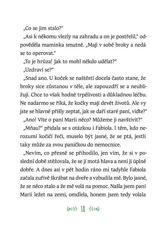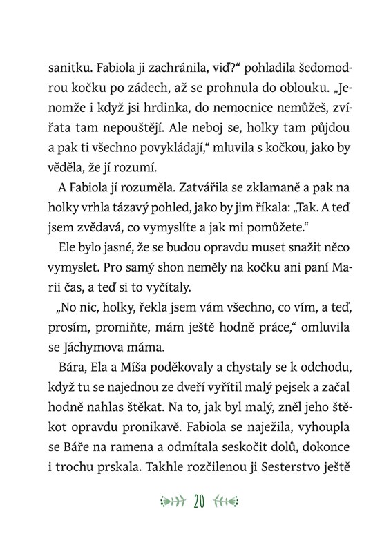 Sesterstvo vstoupilo do nového školního roku a hned od začátku je toho trochu moc: hora učení, zvláštní nový kluk ve třídě, paní Marie v nemocnici… a jedna velká záhada, která holky tentokrát přivede do skutečného nebezpečí. Ještěže mají kouzelnou kočku Fabiolu, která jim vždy se vším pomůže! Jenže tentokrát bude mít napilno, takže si Bára, Ela a Míša možná budou muset vystačit samy. Dostanou se na stopu člověka, který se neštítí trápit zvířata?