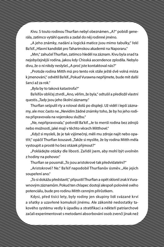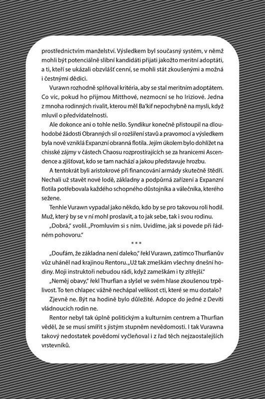S mohutnou expanzní flotilou v zádech a pomocí své přítelkyně, admirálky Ar’alani, začíná Thrawn kousek po kousku shromažďovat odpovědi, které hledá. Ale zatímco proniká hlouběji do ohromných dálav vesmíru, jež jeho lid nazývá Chaosem, zjišťuje, že úkol, kterým byl pověřen, není takový, jakým se zdál.
