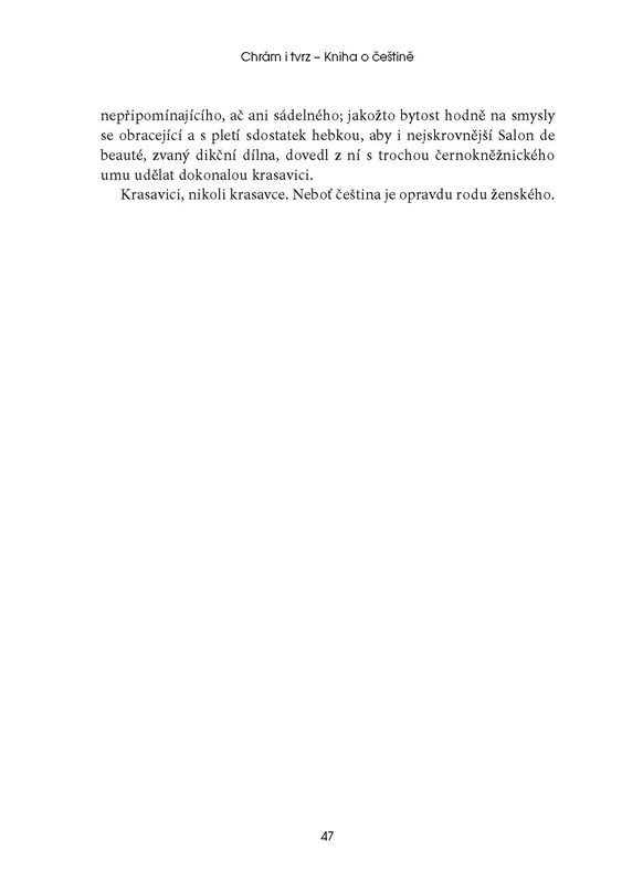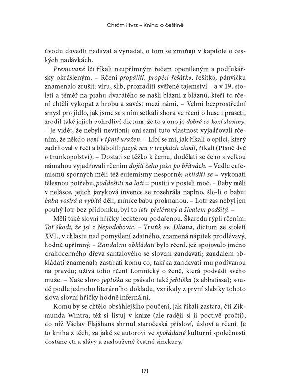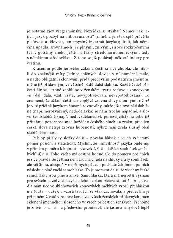Proslulé dílo, jež je nejen odborným výkladem, ale především vyznáním lásky k českému jazyku. Téměř na osmi stech stranách autor postihuje češtinu ve všech jejích mnohotvárných a nevyčerpatelných aspektech, z hlediska mluvnického i slohového. Krátké kapitoly věcně a utříděně, vtipně, s humorem a ironií, rozhněvaně i kriticky popisují a analyzují způsob našeho vyjadřování. Jde o poutavé vyprávění o naší mateřštině, o úžasné kulturní stavbě podobné chrámu i tvrzi.