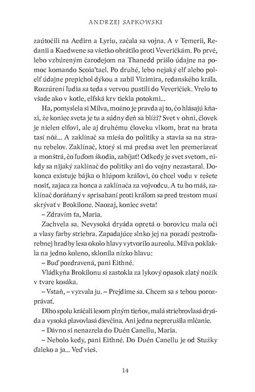 Dryády dokázali zázraky a vyliečili Geraltovo zlomené telo. Rany na jeho duši však bolestivo tepú, keď precitne do sveta bez Ciri. Nedokáže vystáť, že je z nej len politická figúrka. Napriek nevôli dryád sa s novou spoločníčkou unáhlene vydáva na neistú záchrannú výpravu. Samotársky zaklínač by najradšej putoval sám, no cesta ho zvedie dokopy s tými najneočakávanejšími kumpánmi. Prebrodia sa vojnou zdevastovanou krajinou k Ciri včas alebo dievča zhltnú nemilosrdné hry osudu?